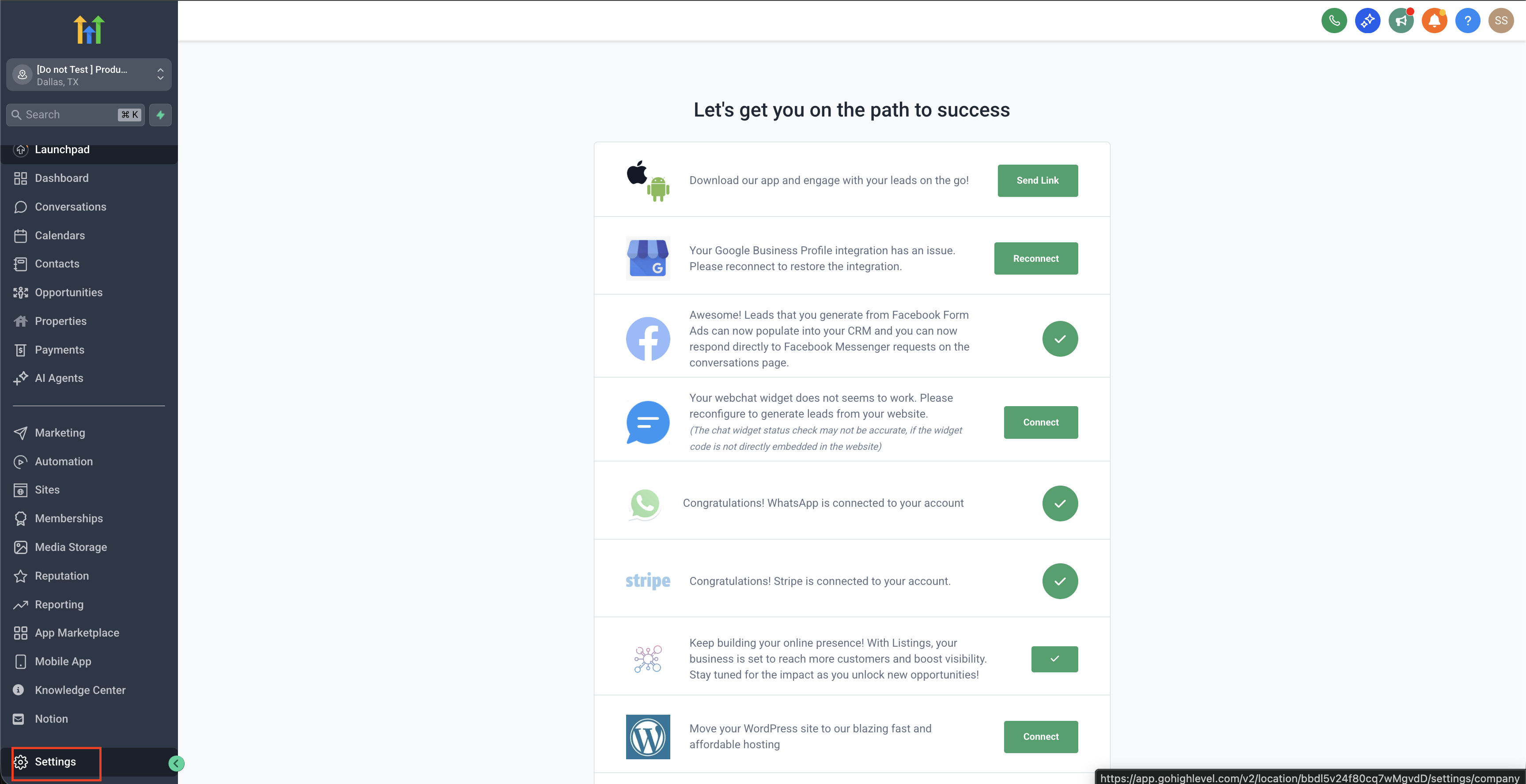 - STEP 1: Locate and select Settings within your HighLevel subaccount: