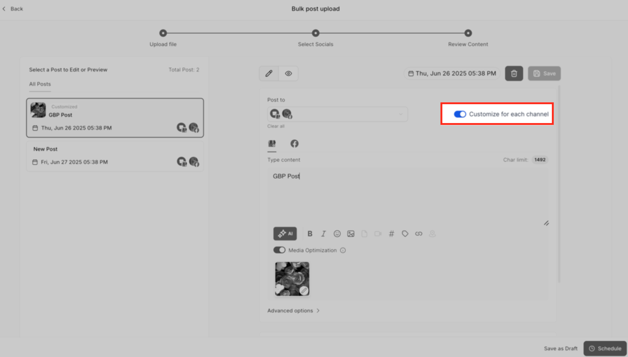 By toggling this on, you can create unique content for each platform, considering their individual character limitations and media formats like images/videos.