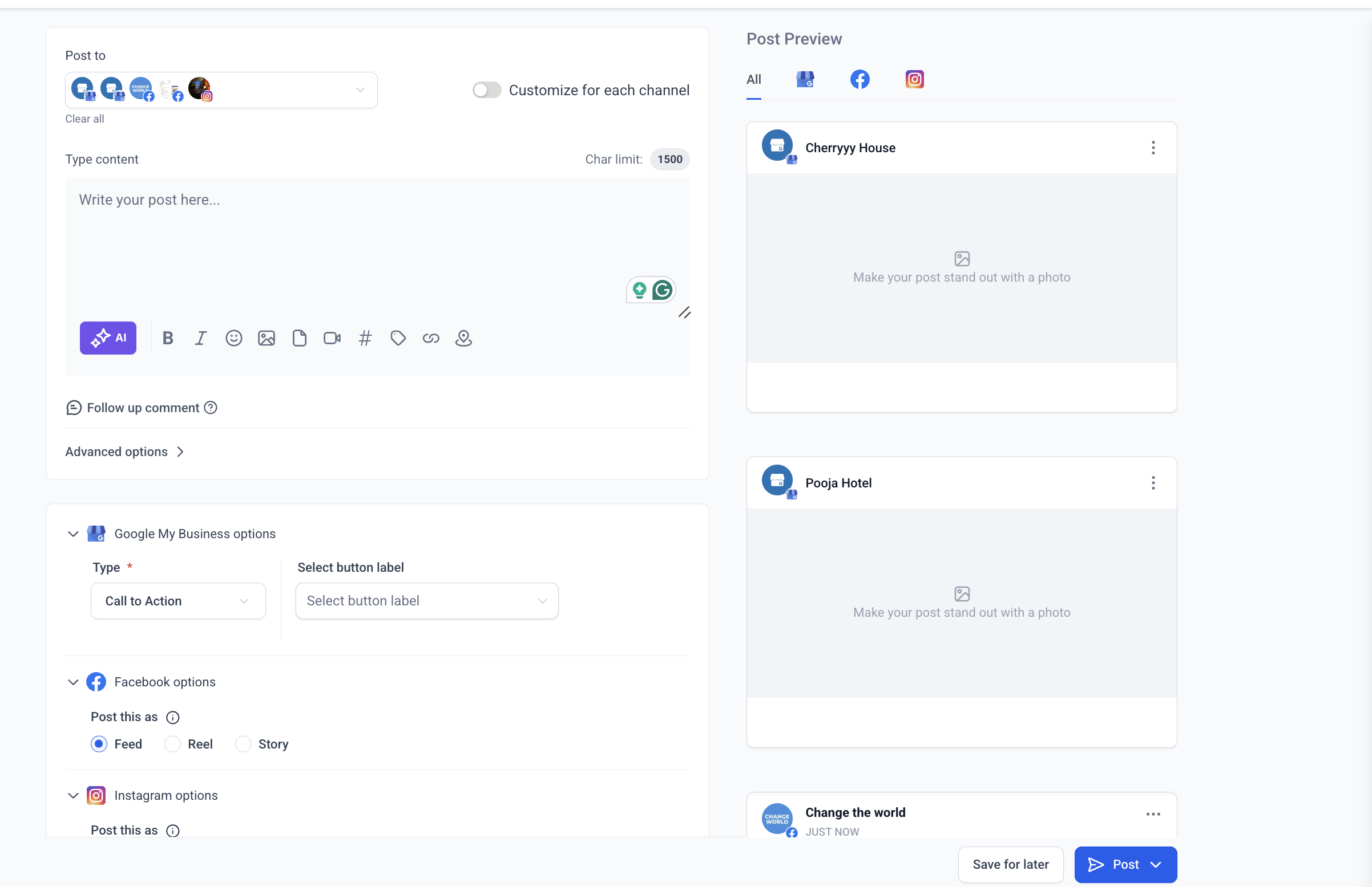 Once you've crafted the content for each channel, you can post it immediately or schedule it later.