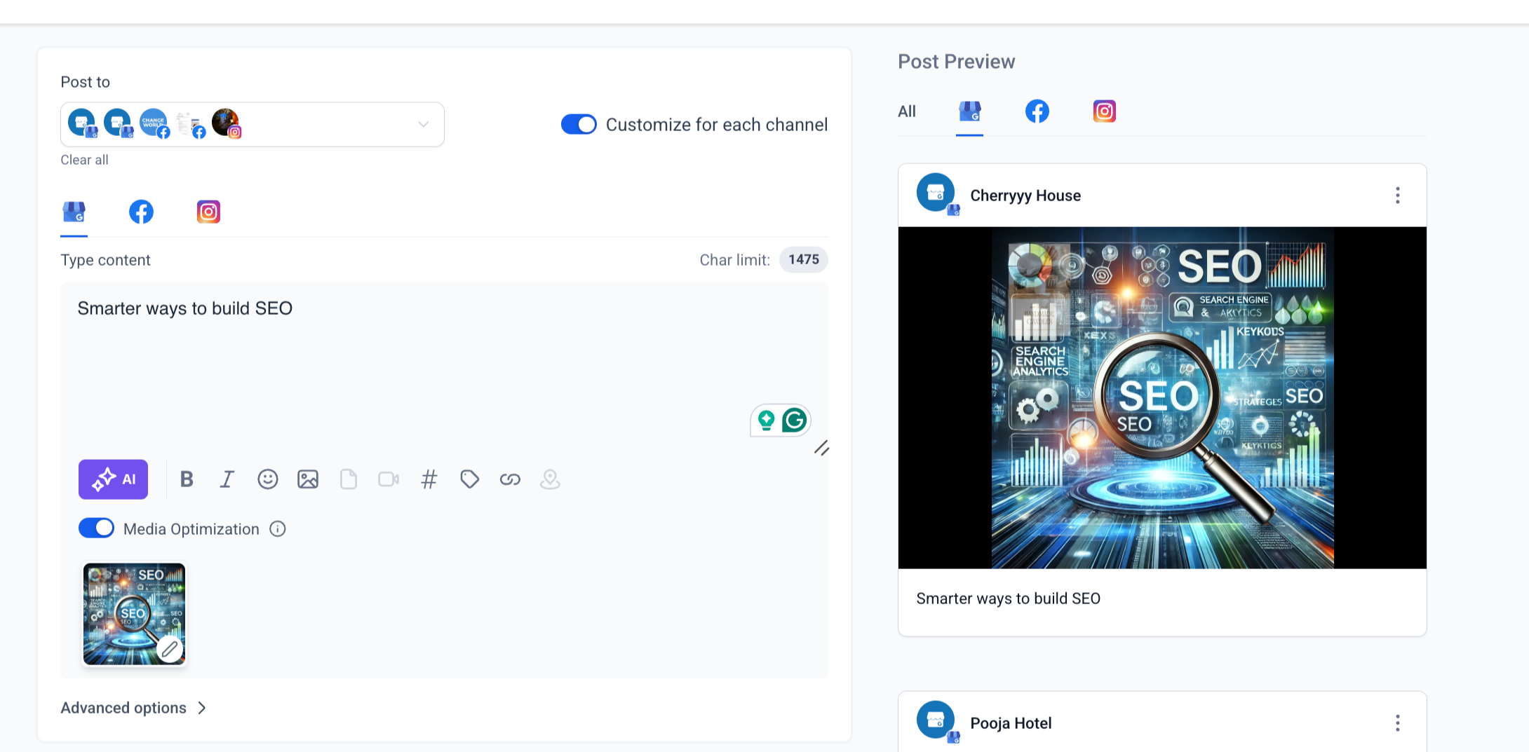 Content Customization: Recognizing the disparities in character limits among various social media channels, this feature allows for individualized content crafting. Whether you want a short message for LinkedIn or an extended post for Facebook, you can create both within the same interface.
