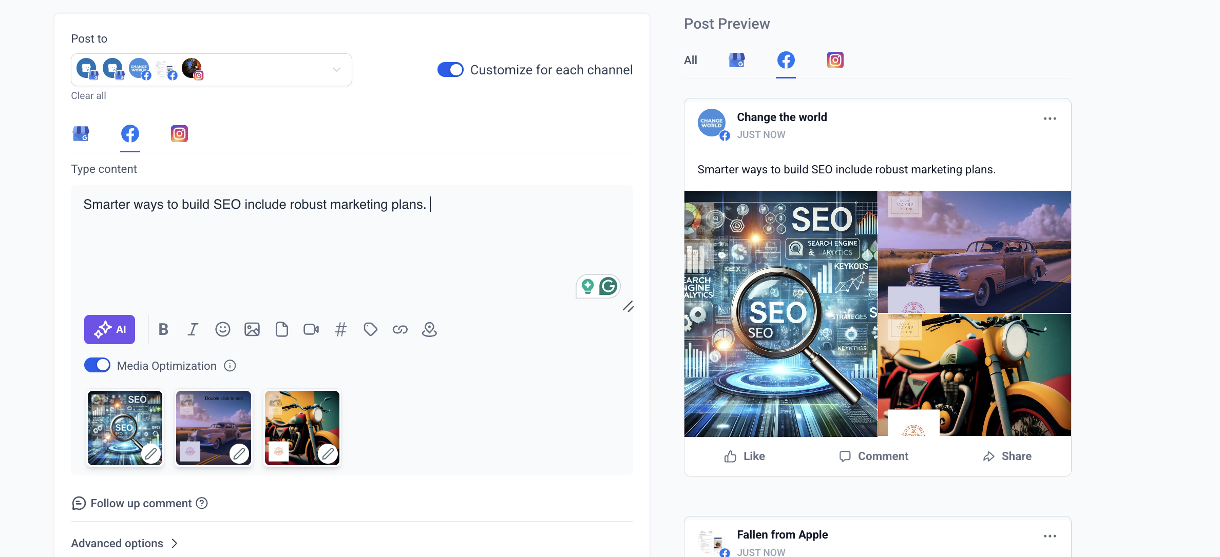 The "Customize for Each Post" feature is an innovative tool that allows marketers, businesses, and individuals to create and manage tailored content for different social media channels, all within one interface. Here's a thorough understanding of what the feature entails: