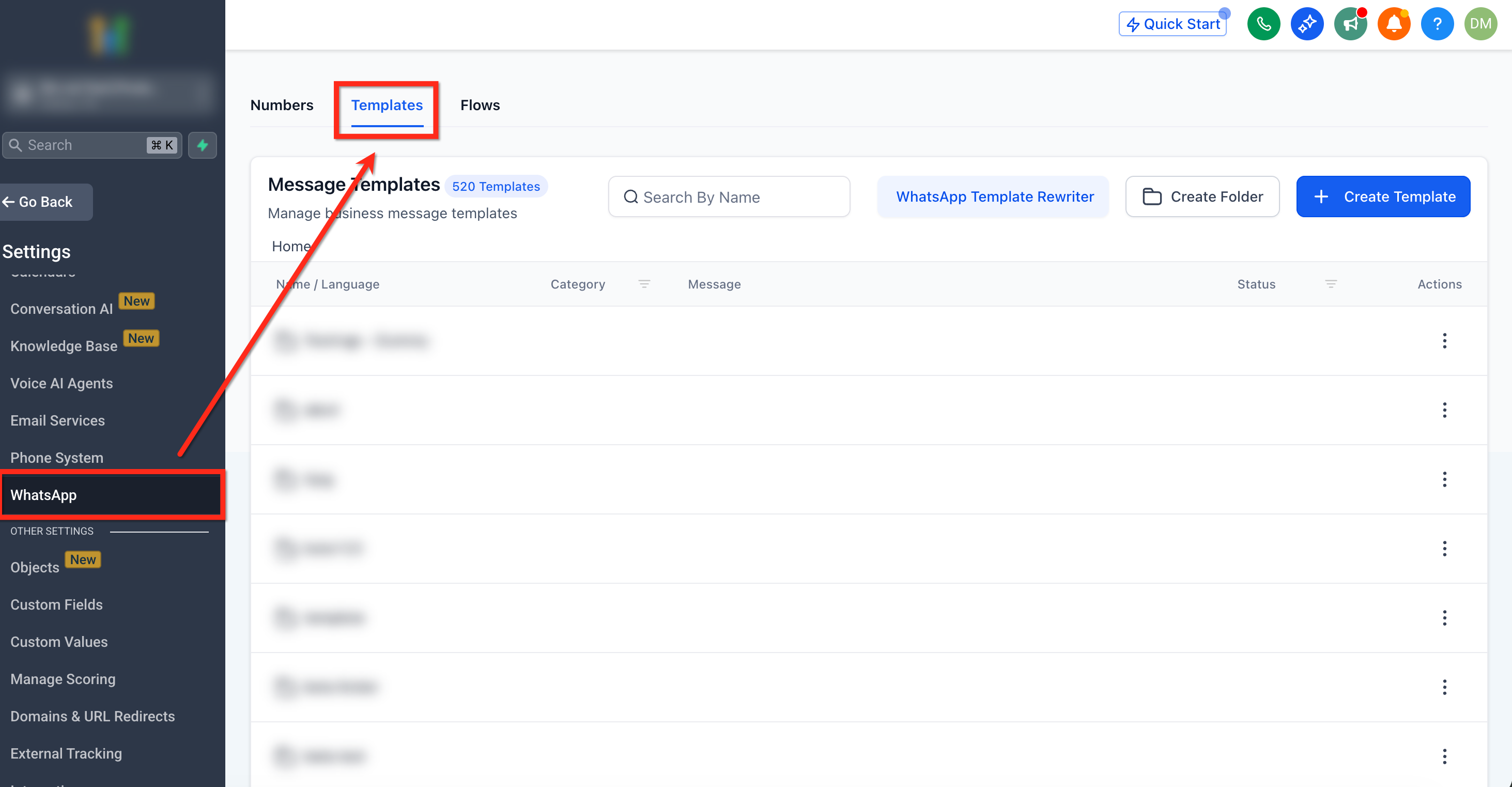 From your sub-account, click Settings in the lower hand corner. From the left navigation bar, click the WhatsApp tab then click the Templates tab in the upper navigation ribbon.