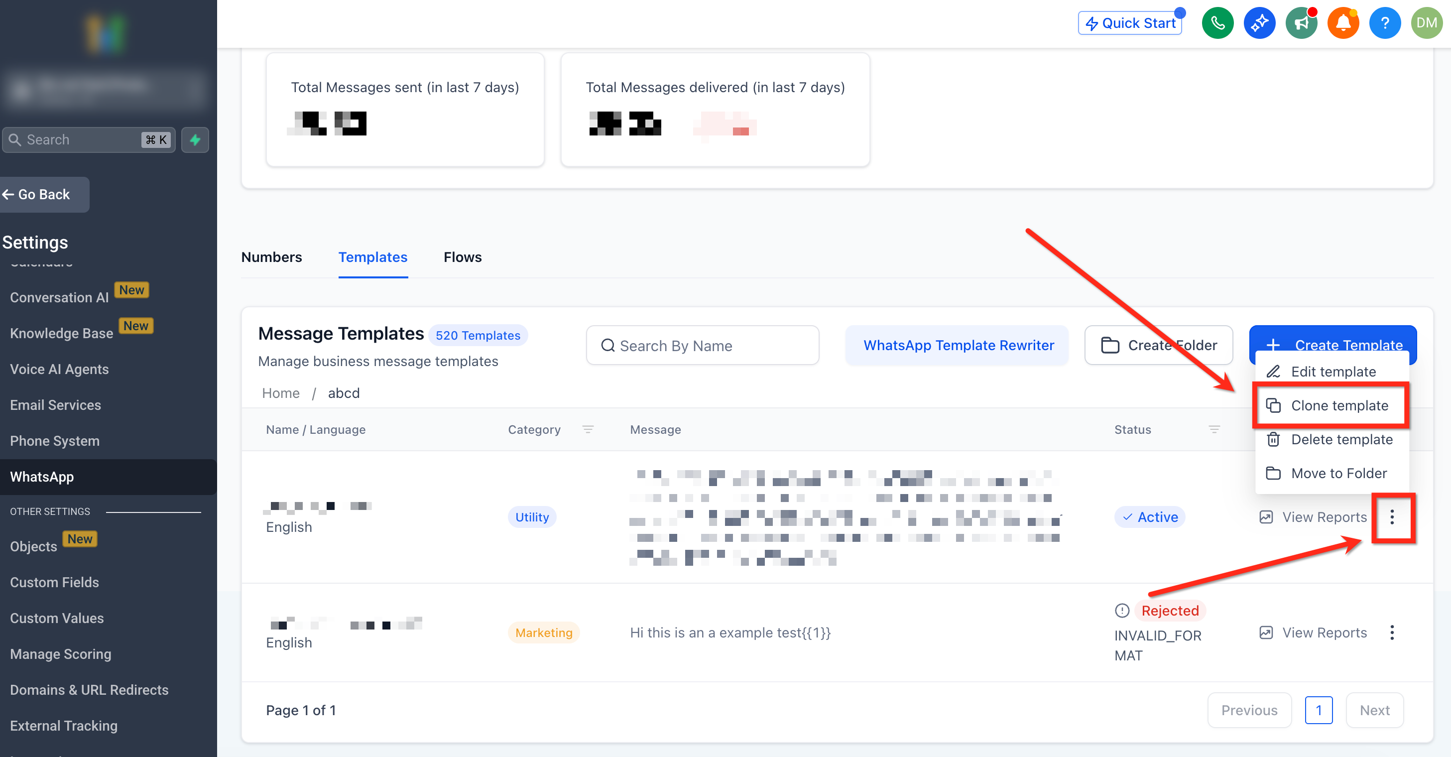 Important: When cloning a WhatsApp template, all variables, buttons, and formatting are retained