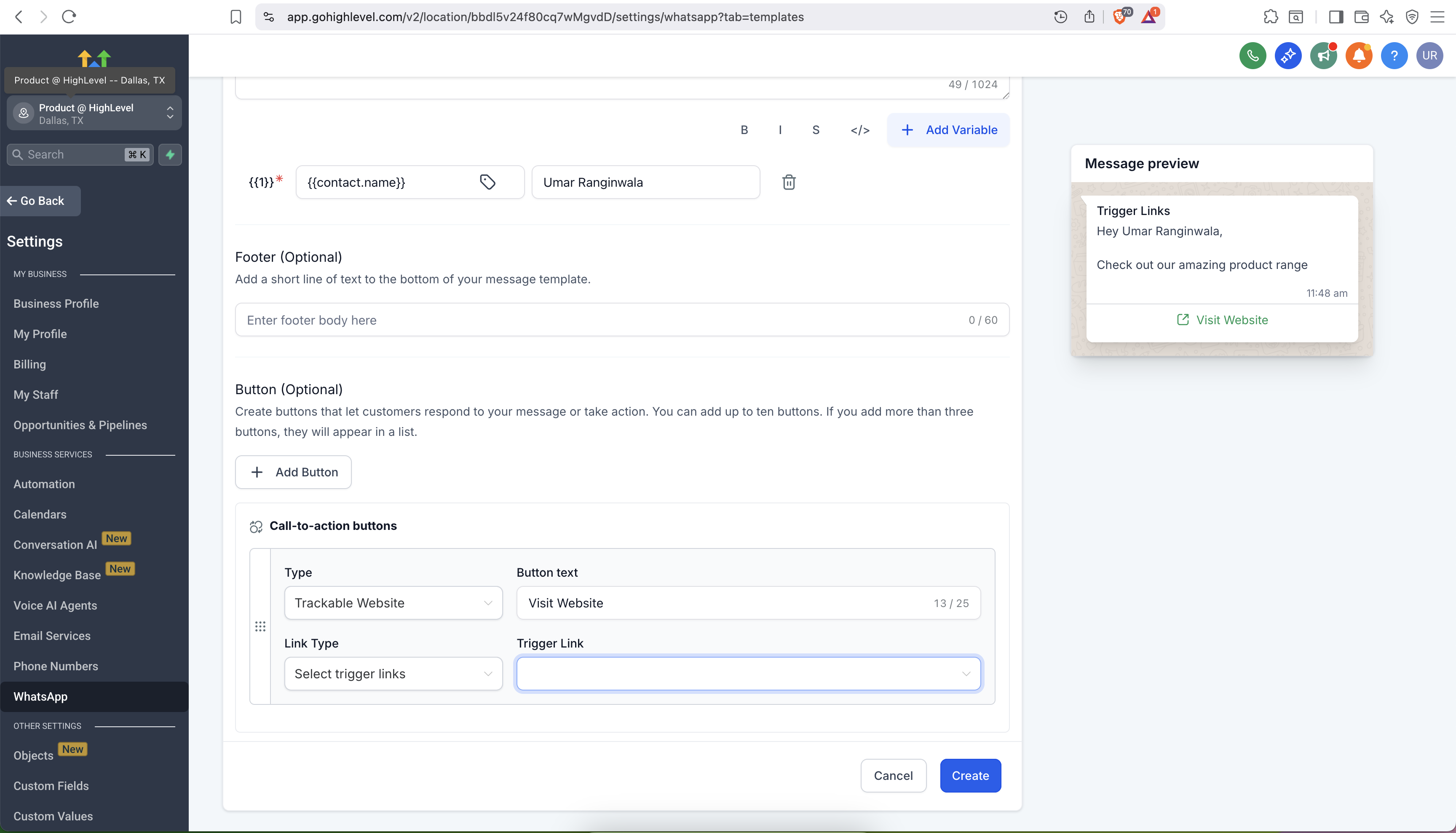 If the “Create” button for WhatsApp messages is inactive (grayed out or unclickable) in your GoHighLevel account, here are the most likely reasons: