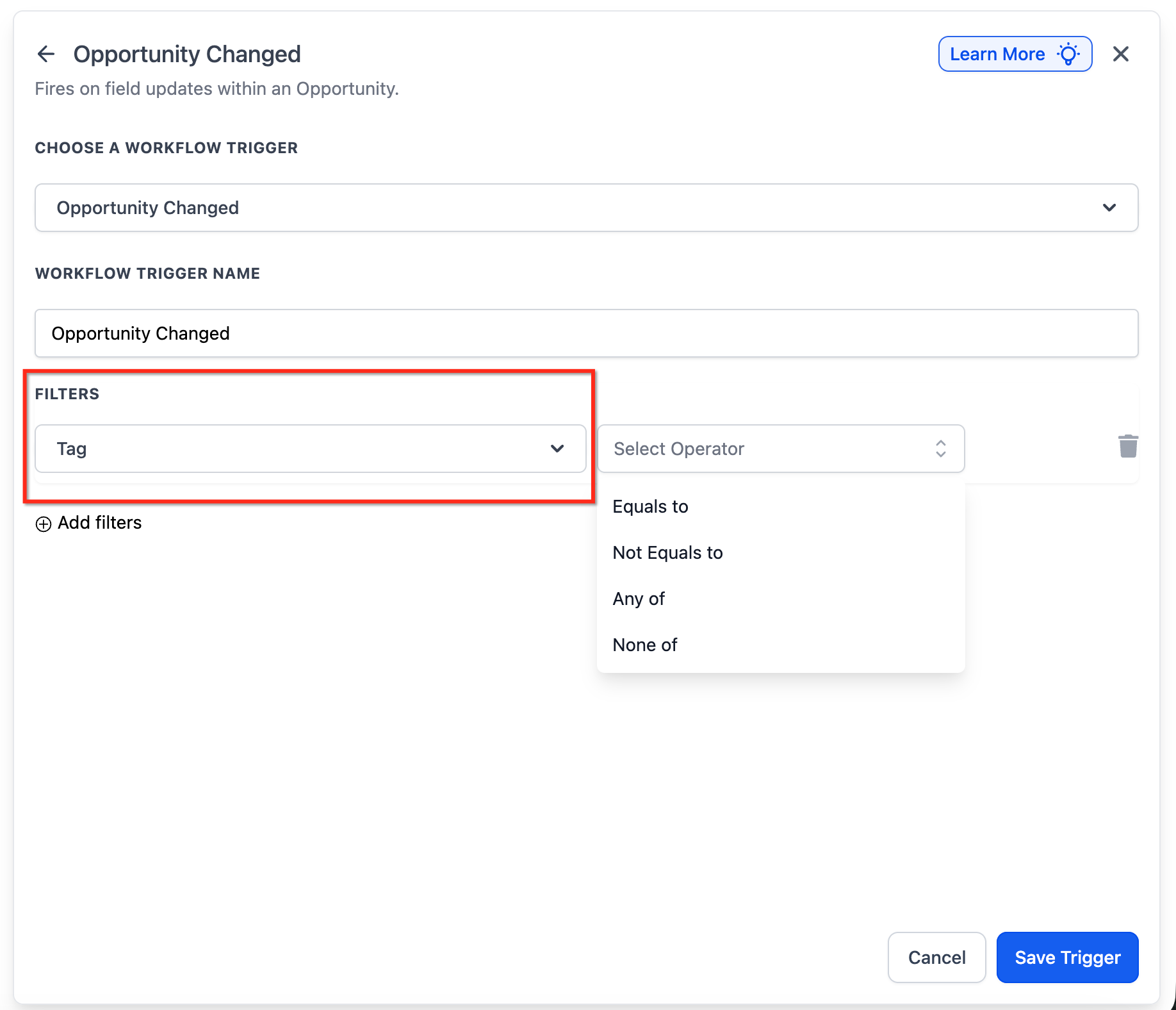 The Tag filter allows you to trigger a workflow based on tags assigned to an opportunity. This filter ensures that automation is only activated when an opportunity contains a specific tag, providing more control over workflow execution.