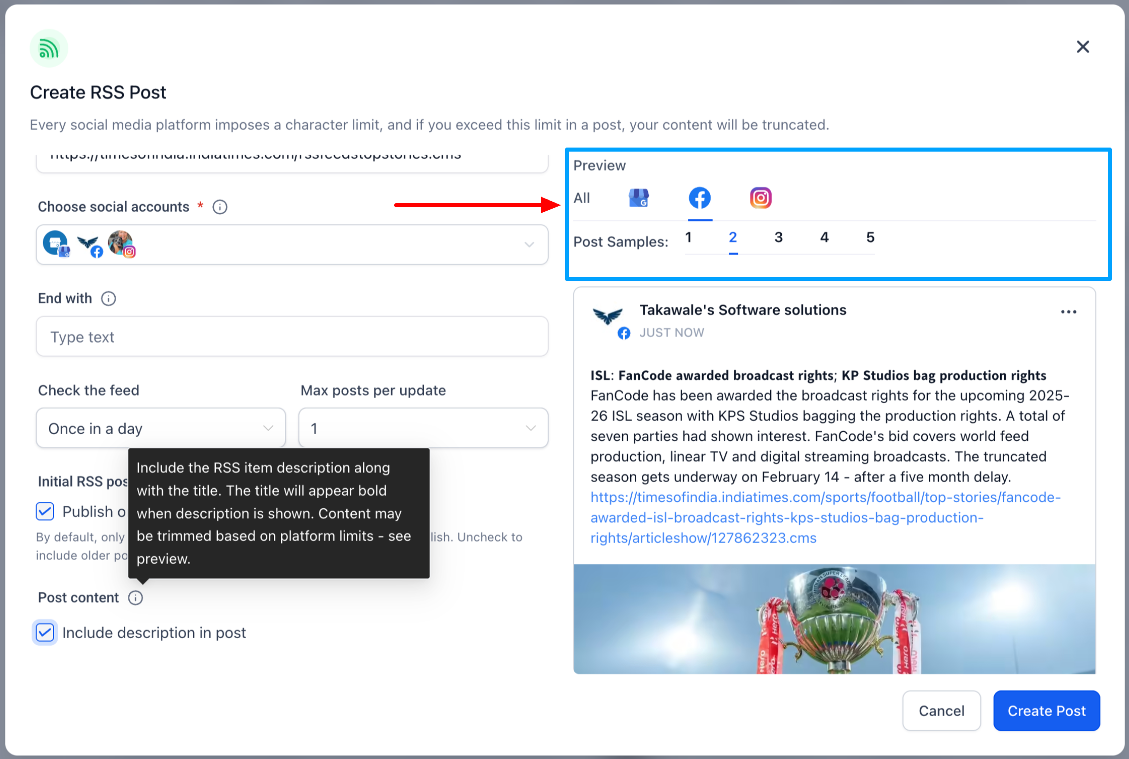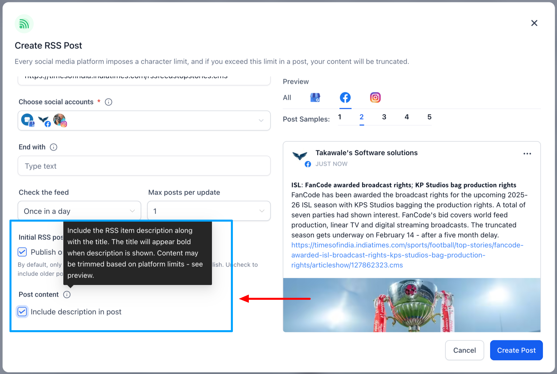 Enable Include Description to publish posts with both the title and description from the RSS feed