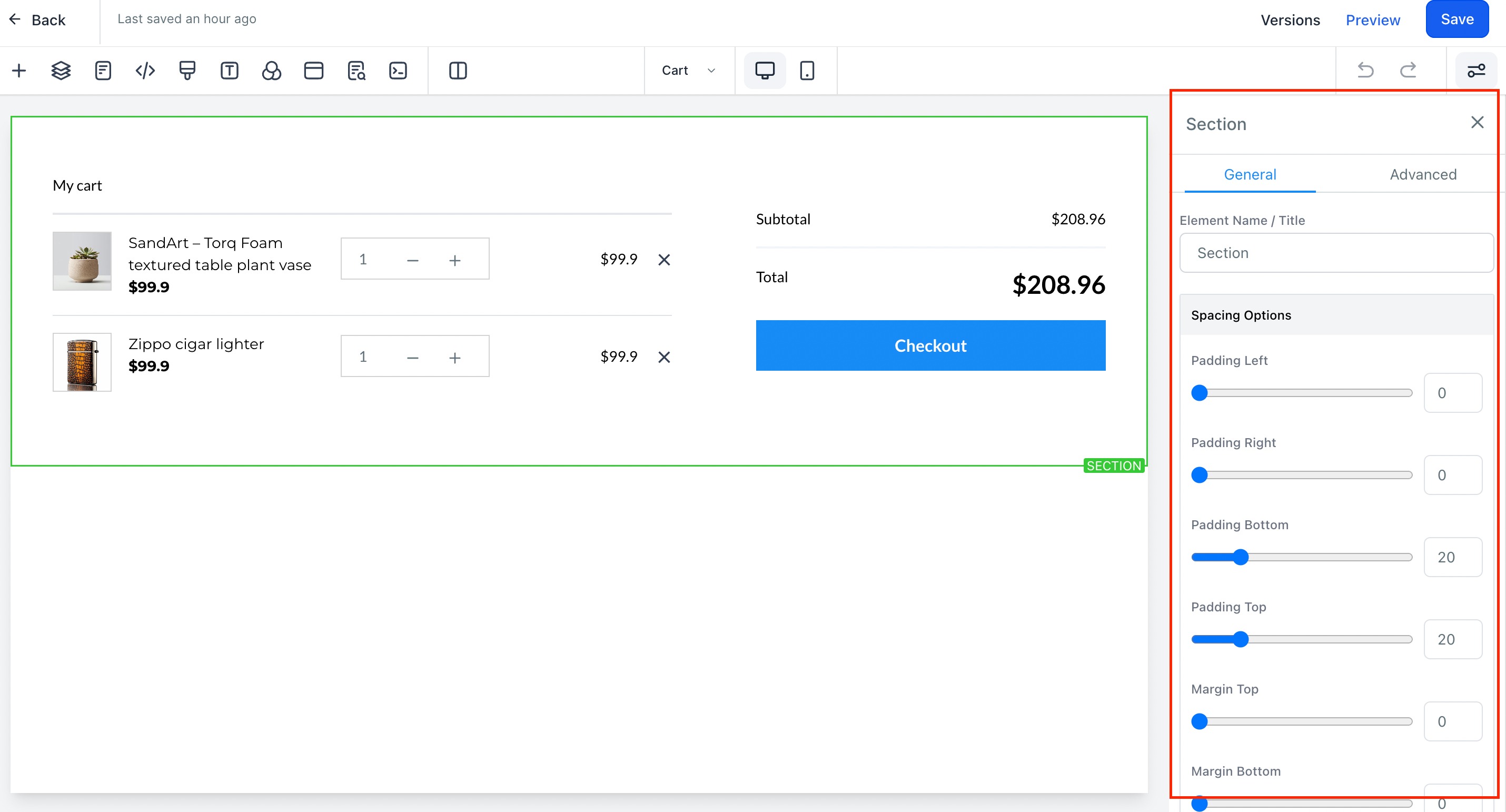 Users will be able to format the elements added by default to match the brand aesthetics of their overall website. Each element will have General and Advanced settings for formatting.