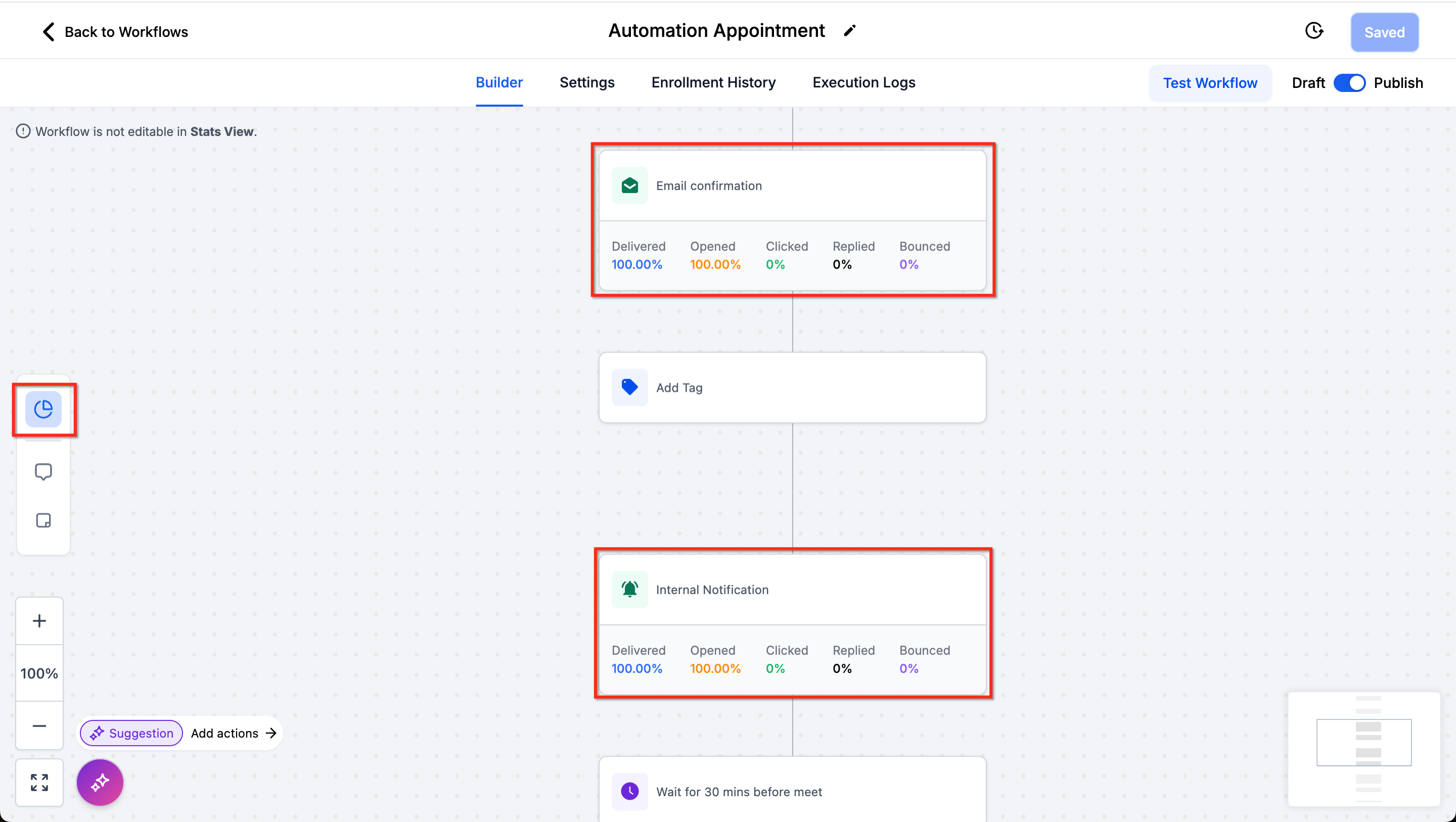 For tips on analyzing workflow performance, explore How to Analyze Workflow Campaigns. Stats are also available at the workflow level in the Workflow List Click the expand arrow under Stats.