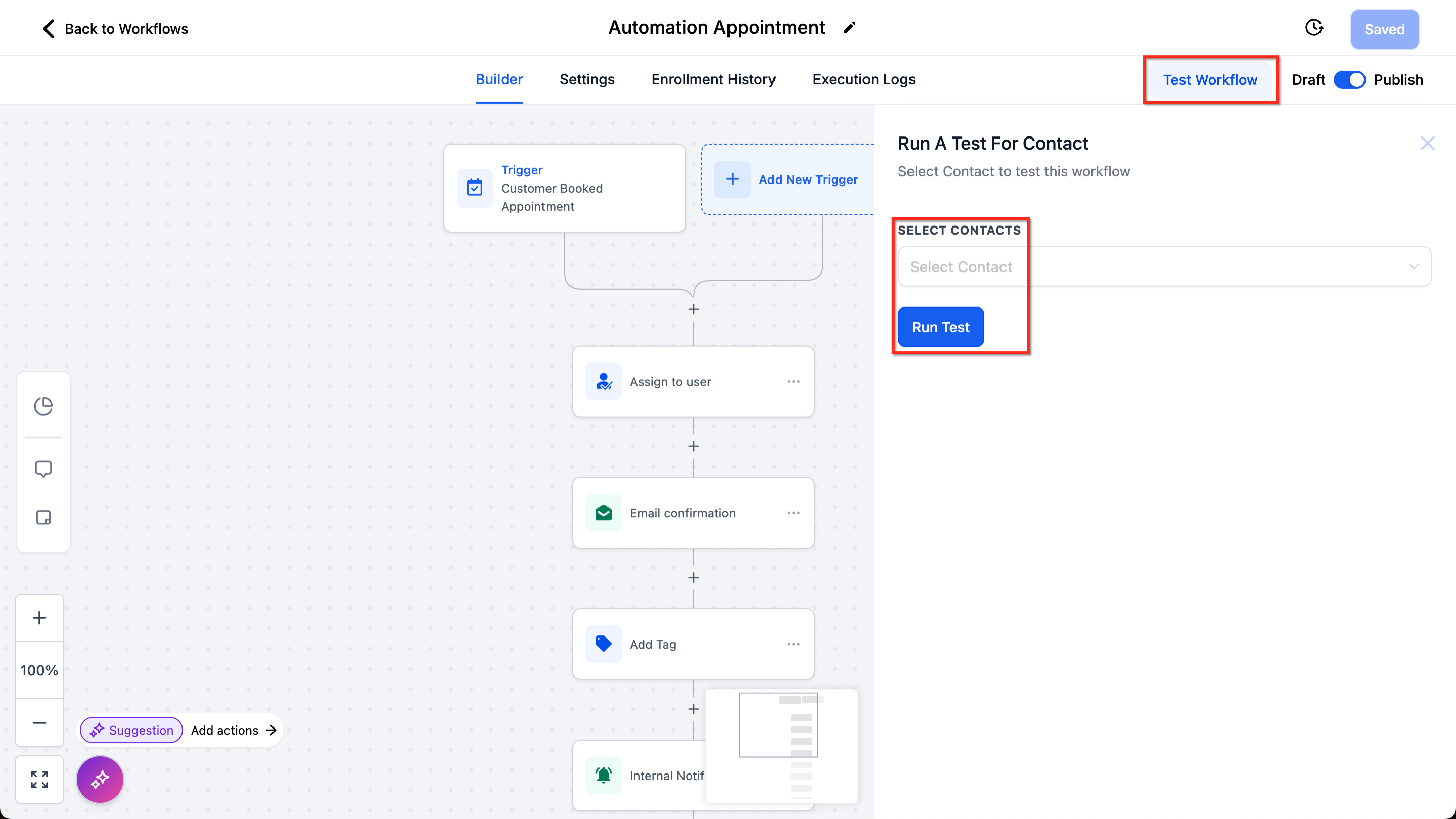 - Click the Test Workflow button in the top-right corner.