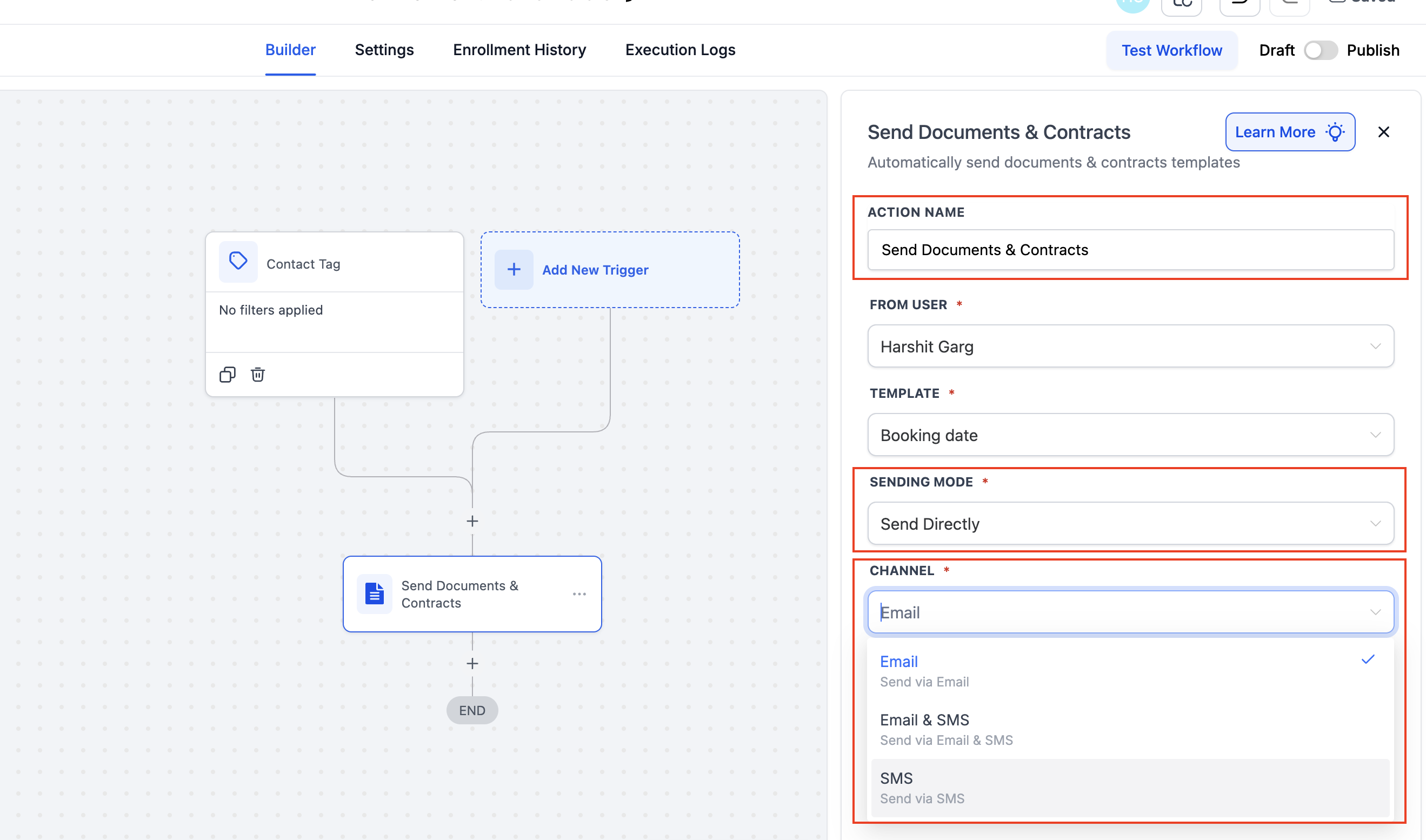 You can automatically send a document template when a specific event happens, such as a tag being added or a pipeline stage change. To use the "Send Documents & Contracts" action, your template must be saved, and the contact must have a valid email address.