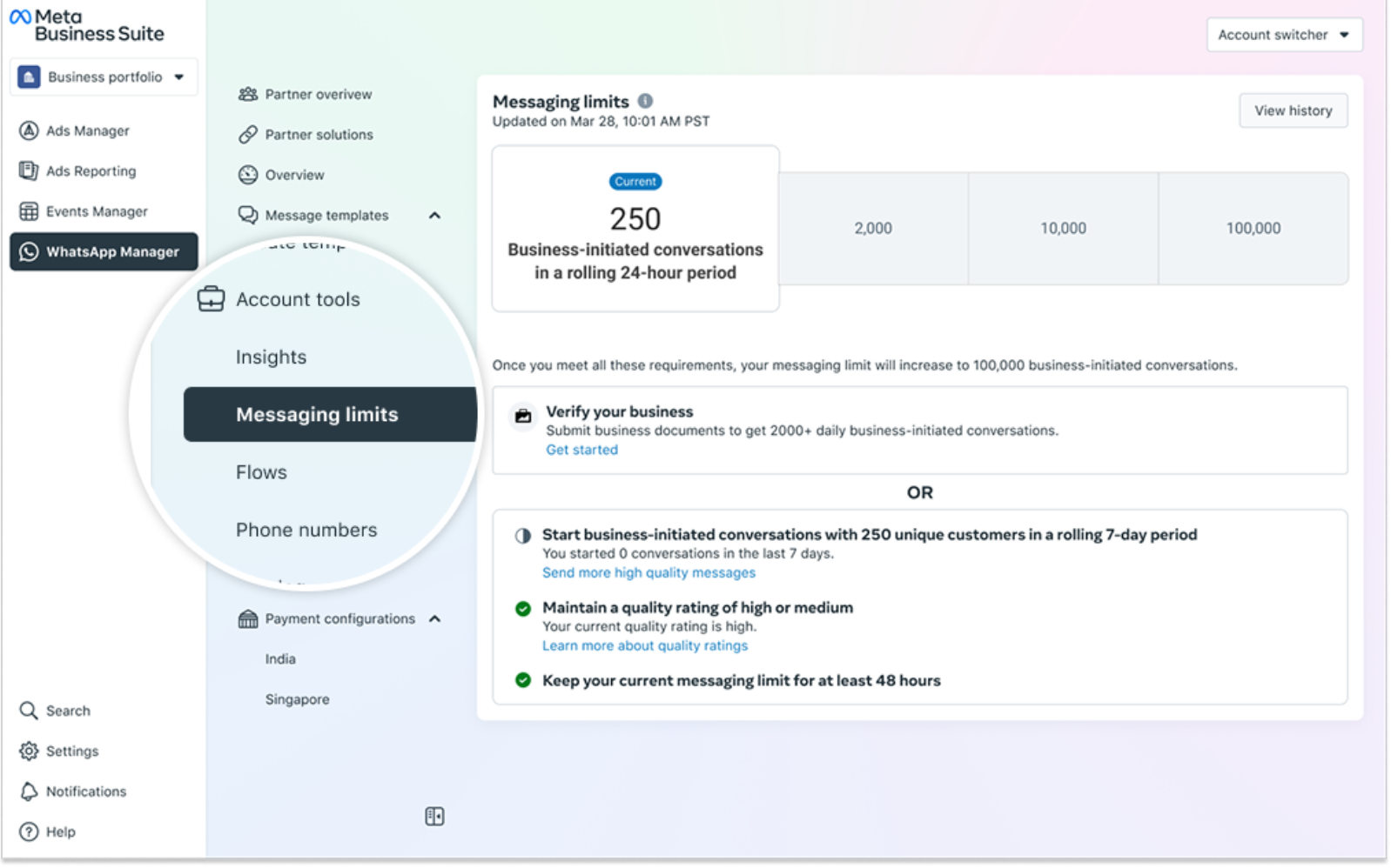 Newly created business portfolios start with a messaging limit of 250. However, this limit can be increased to accommodate higher volumes. The available tiers are: