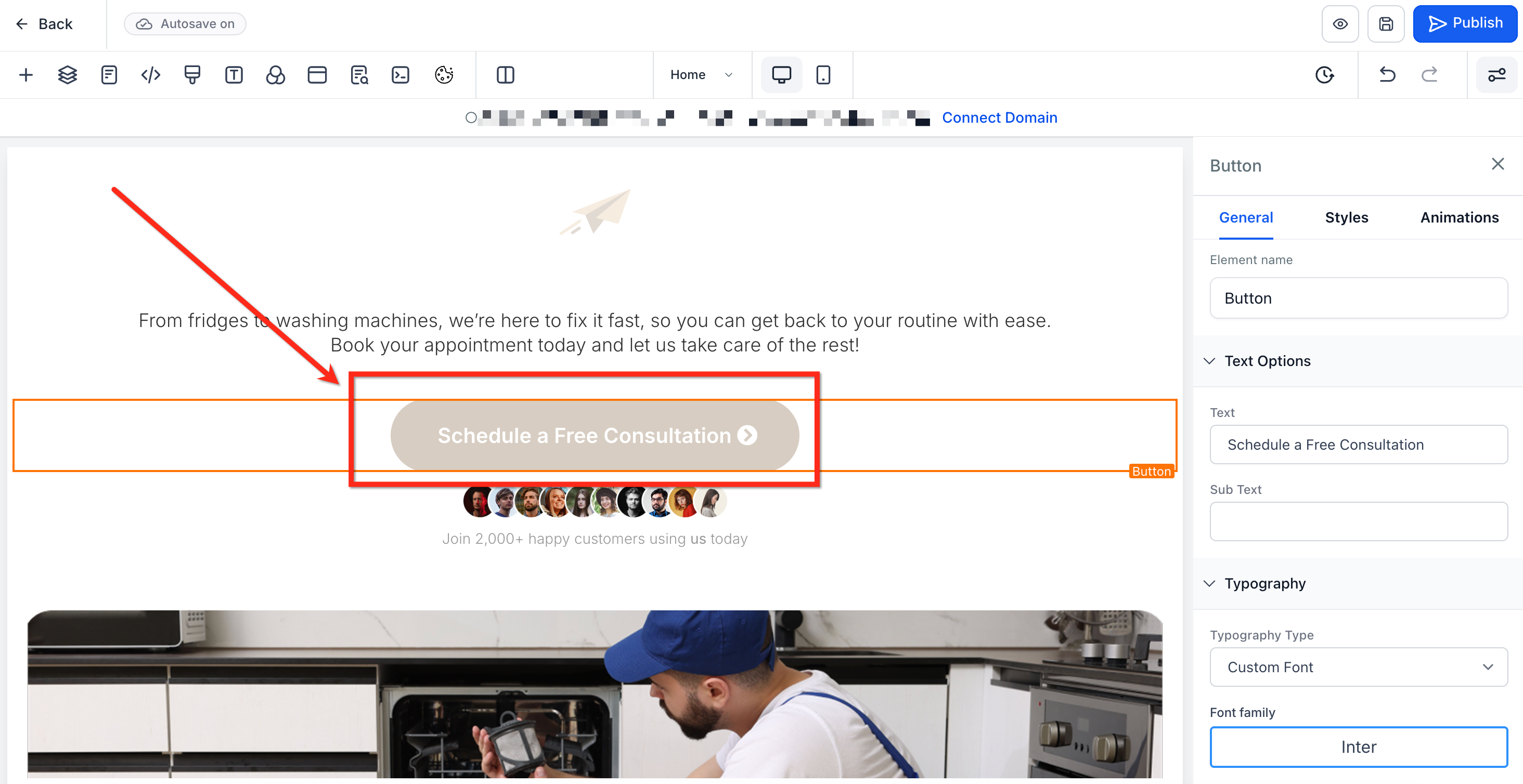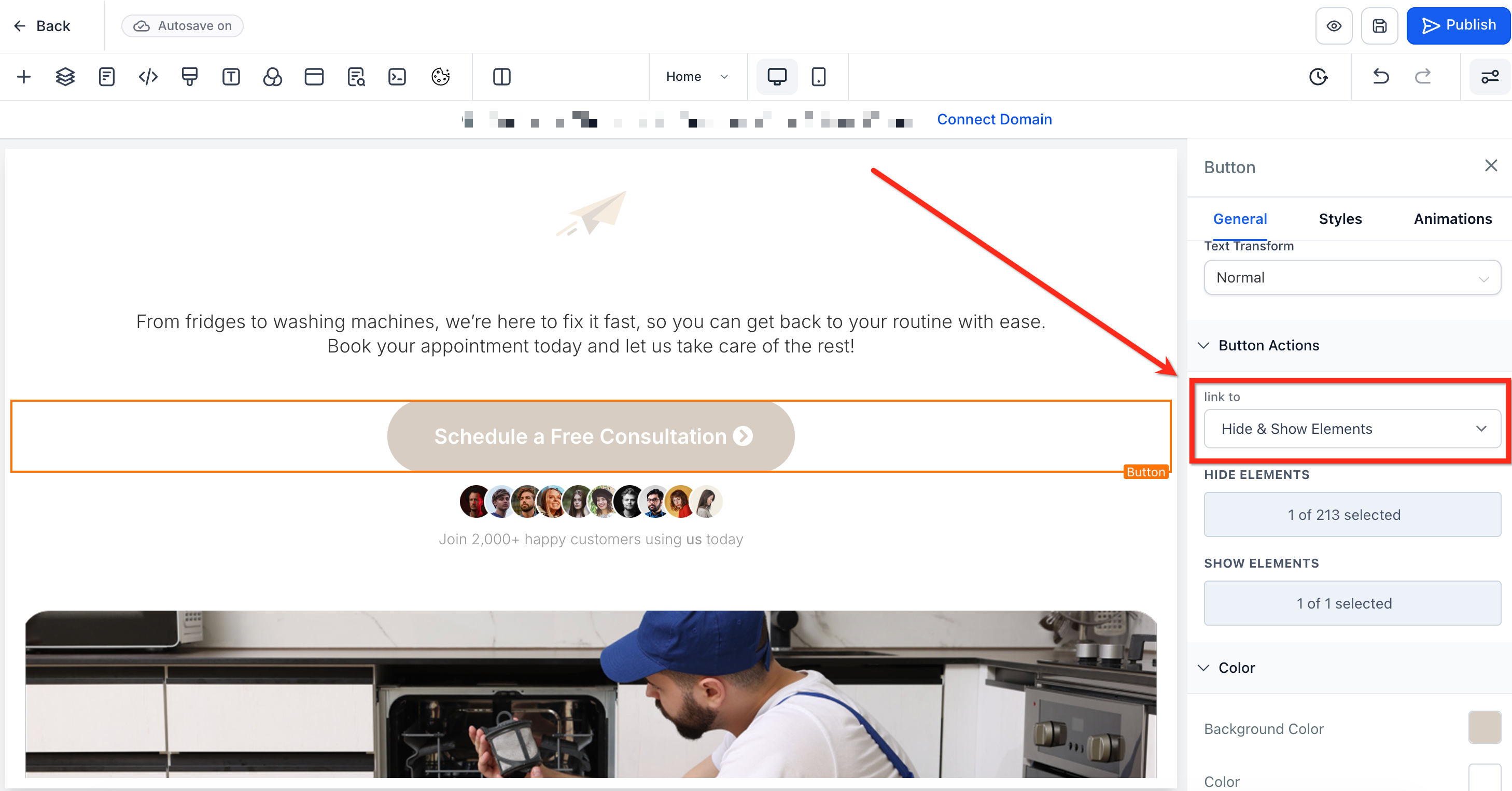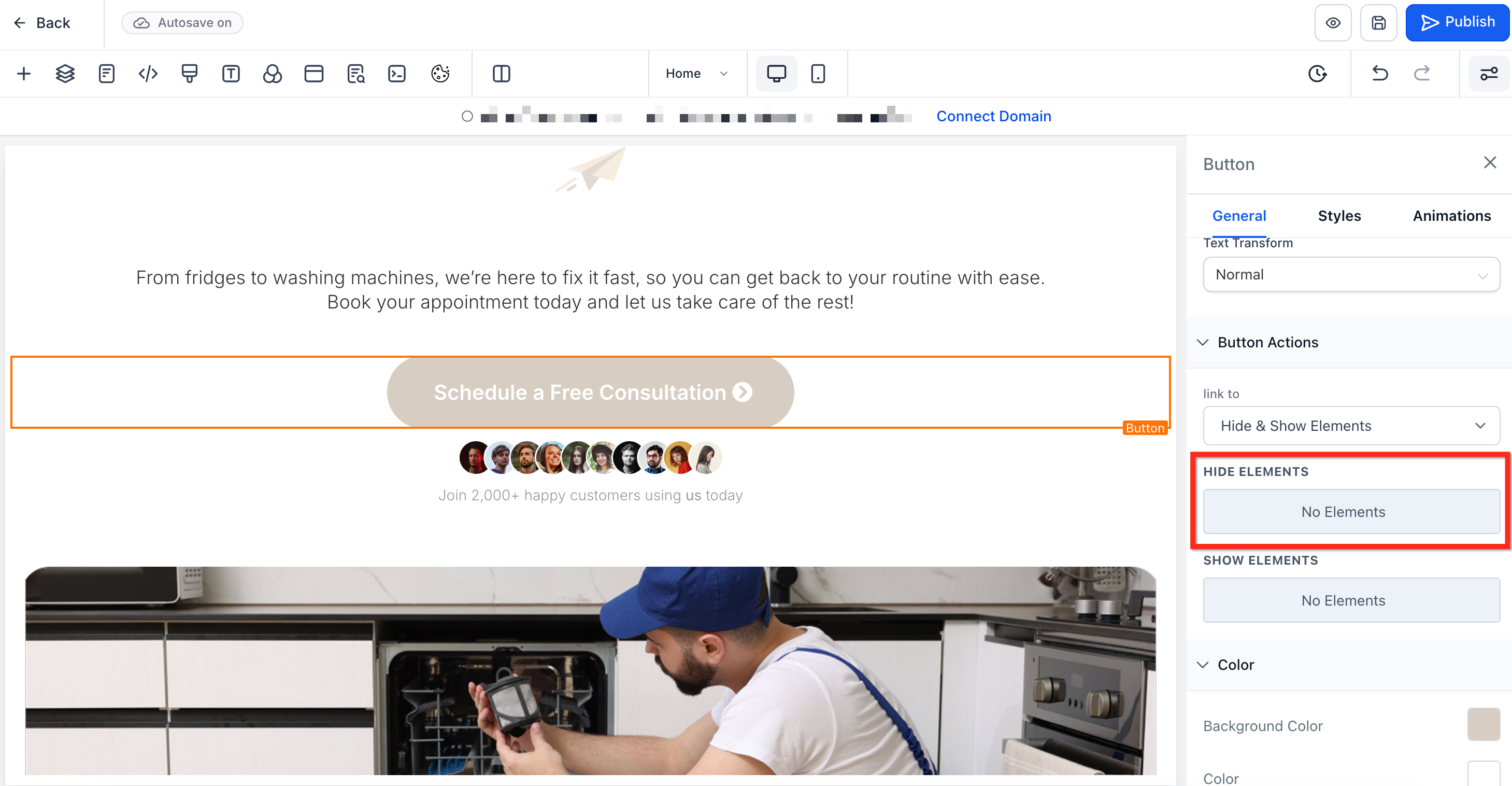 Click Hide Elements to open a dropdown listing all elements in the site page. Choose the element or elements that you'd like to hide when the button is clicked. You can choose an element, a section, a column, or column rows.