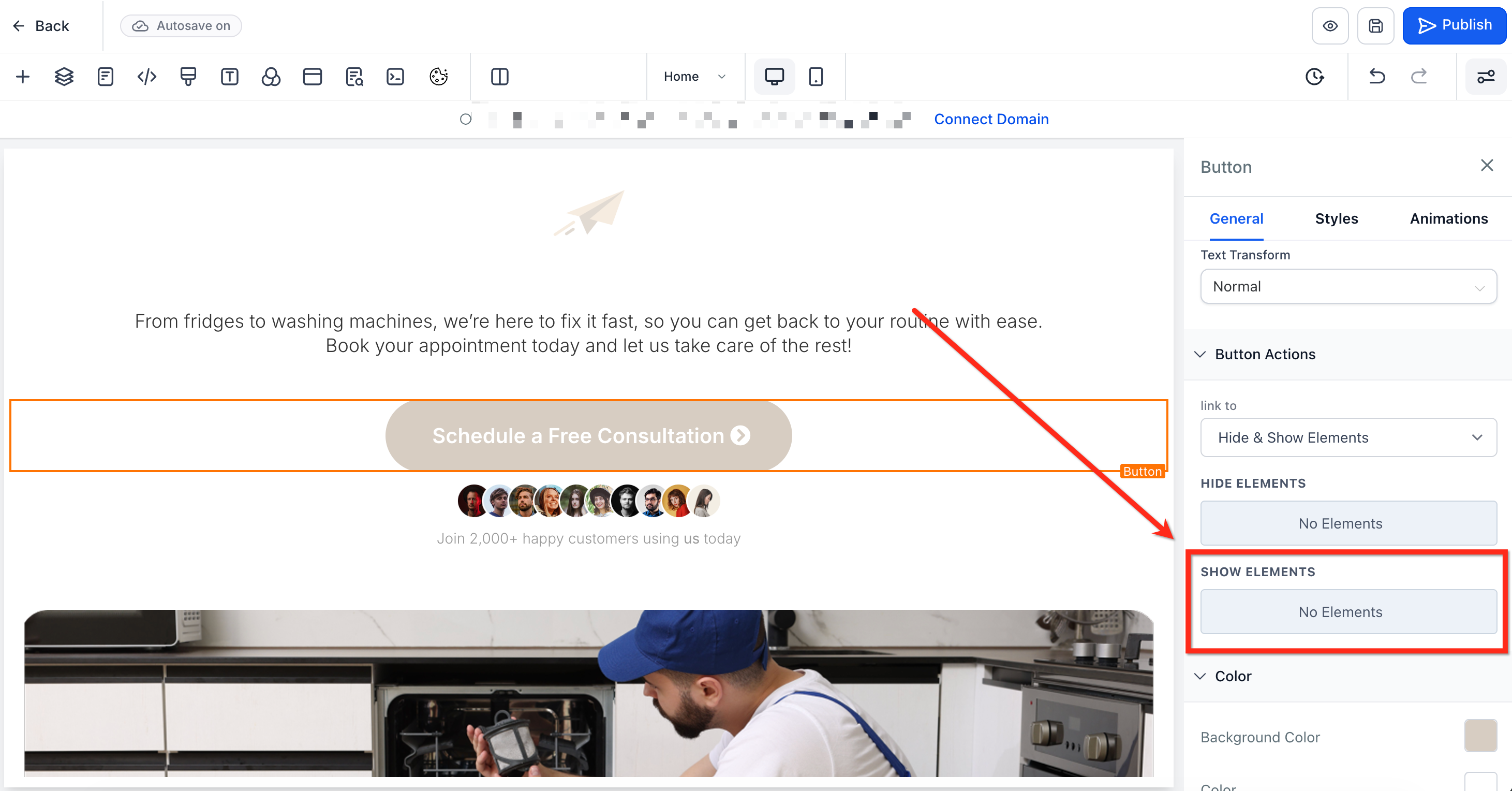Click Show Elements to open a dropdown listing all hidden elements in the site page. Choose the element or elements that you'd like to show when the button is clicked. You can choose an element, a section, a column, or column rows.