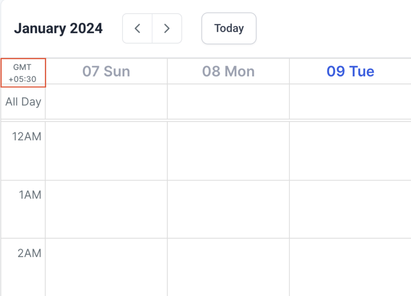 The currently selected timezone appears within the calendar interface so you can confirm which timezone is active.