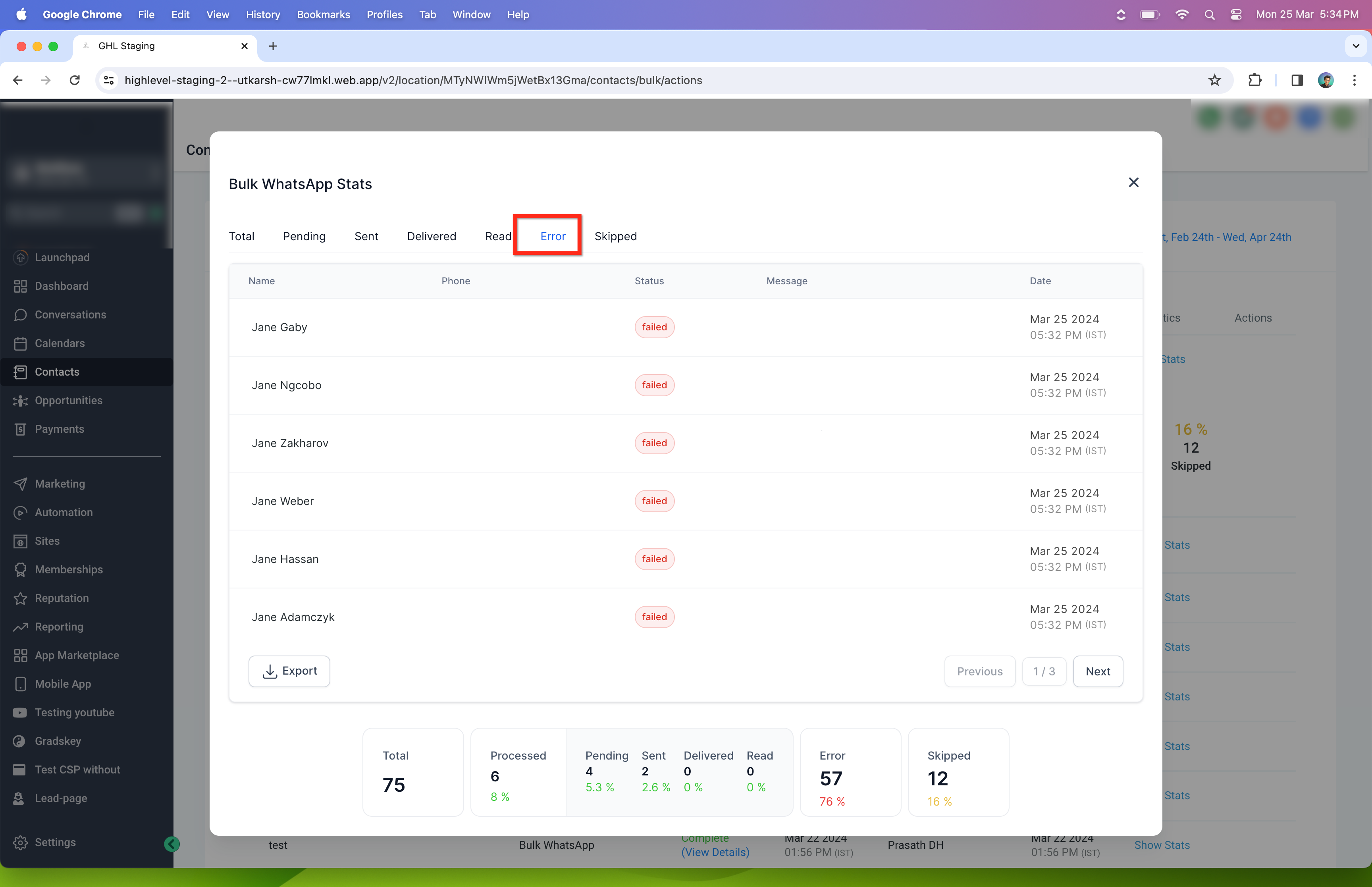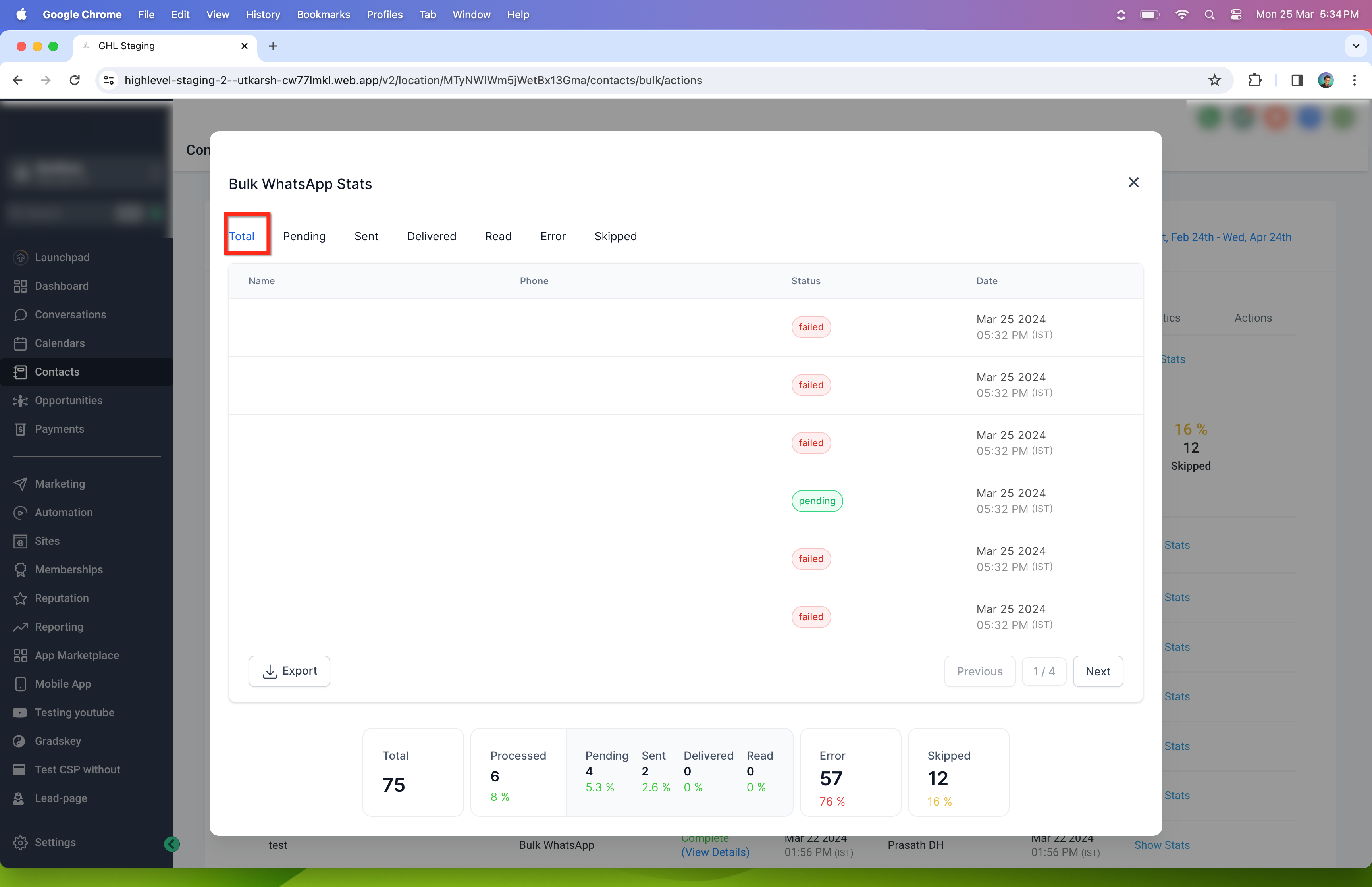 WhatsApp Bulk Action in HighLevel allows you to send approved WhatsApp template messages to multiple contacts at once while tracking delivery, read rates, errors, and skips. With recent updates, templates can be previewed at send time, display category and language information, and allow one-click media replacement—making bulk campaigns easier to review and manage.