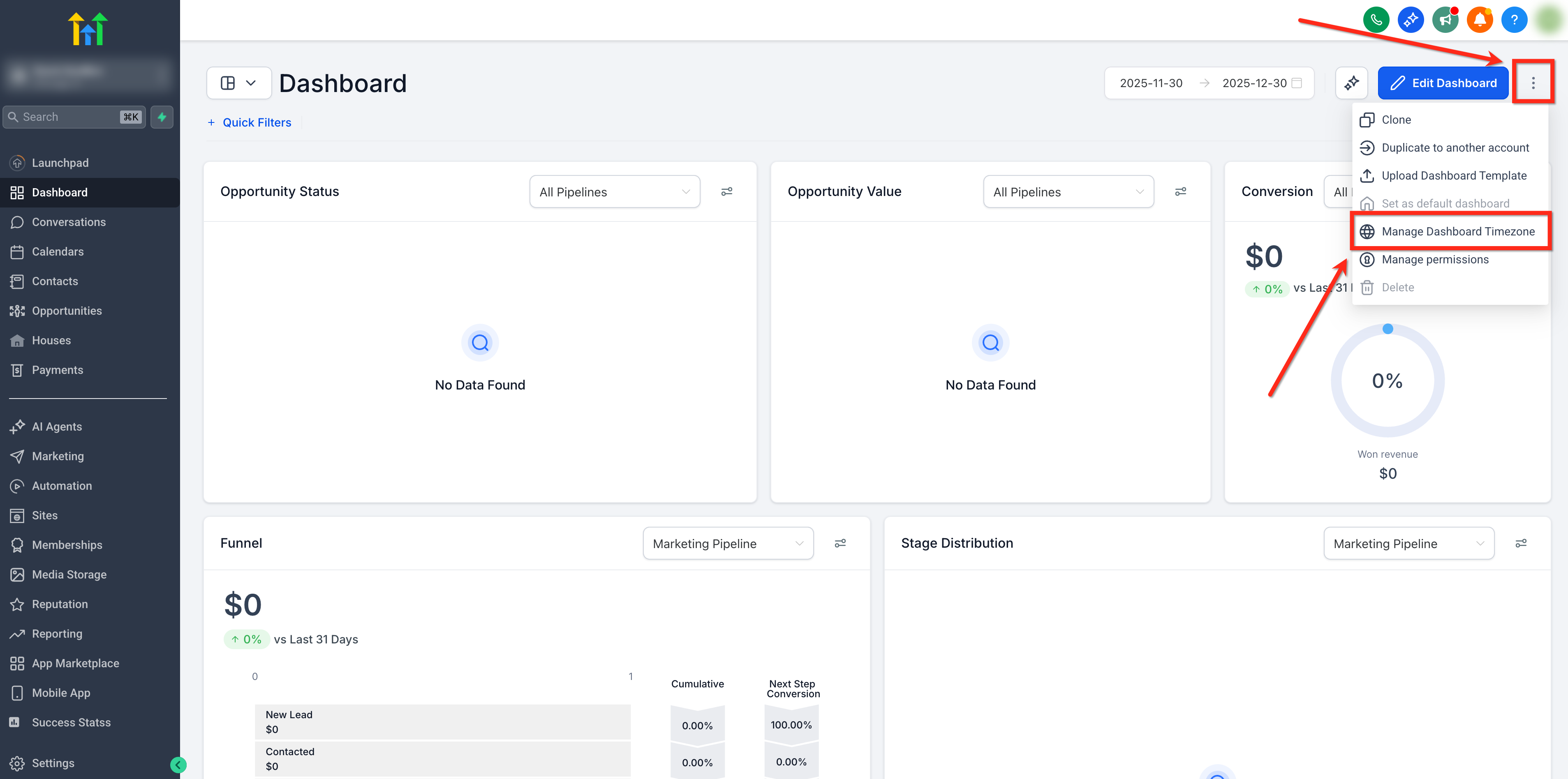 Click on the 3-dot menu icon located on the top right corner and select Manage Dashboard Timezone from the dropdown