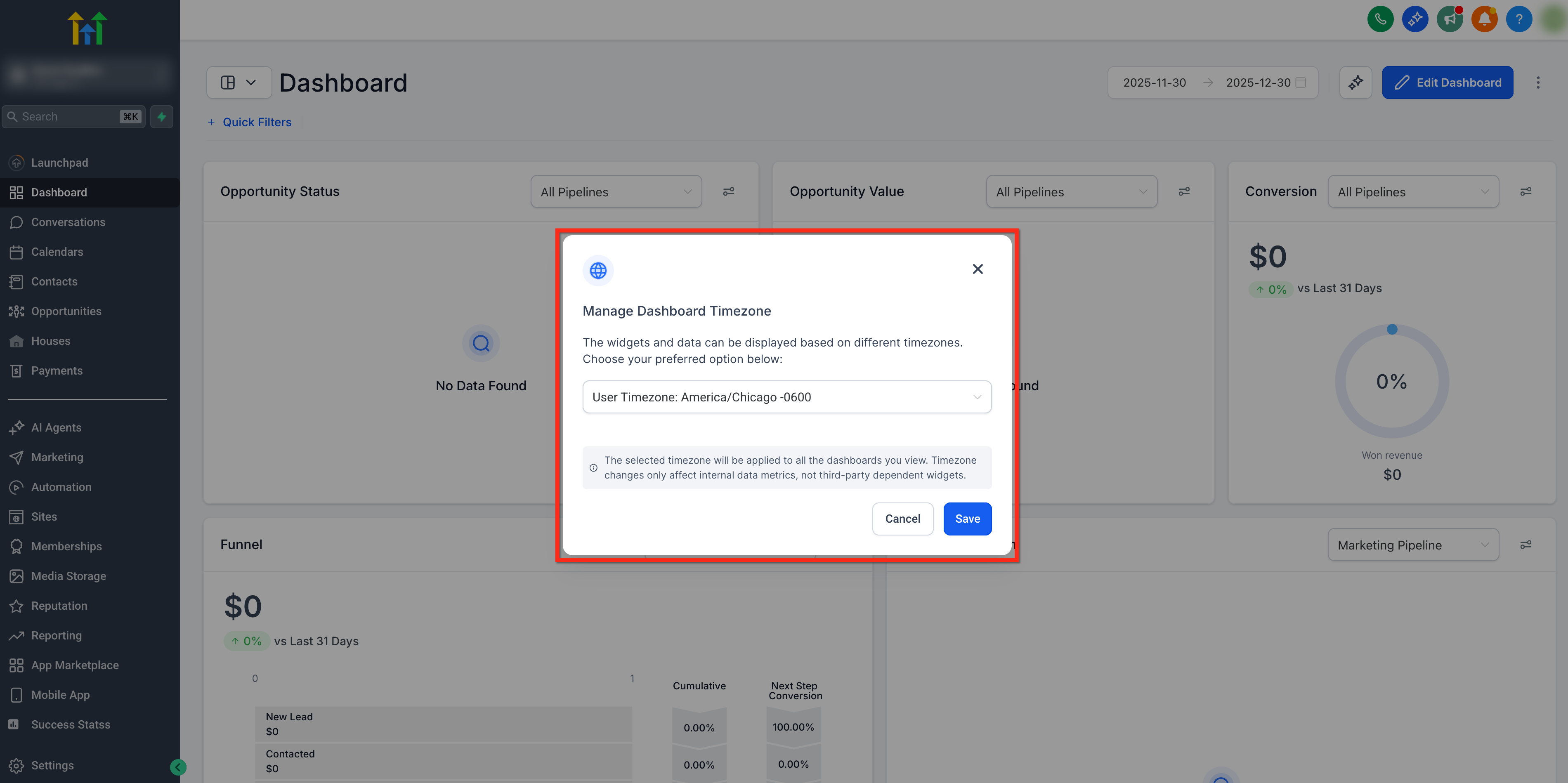 Follow the steps below to change the timezone shown on the dashboard for the logged in user!