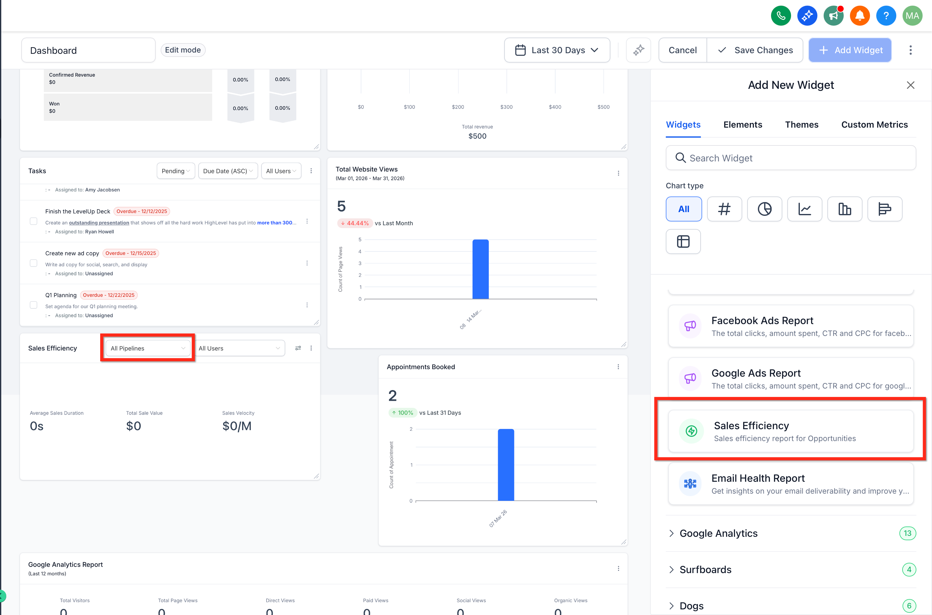By default, Sales Efficiency shows aggregated metrics across all pipelines. To focus on one workflow or sales process, use the Pipeline dropdown in the widget.