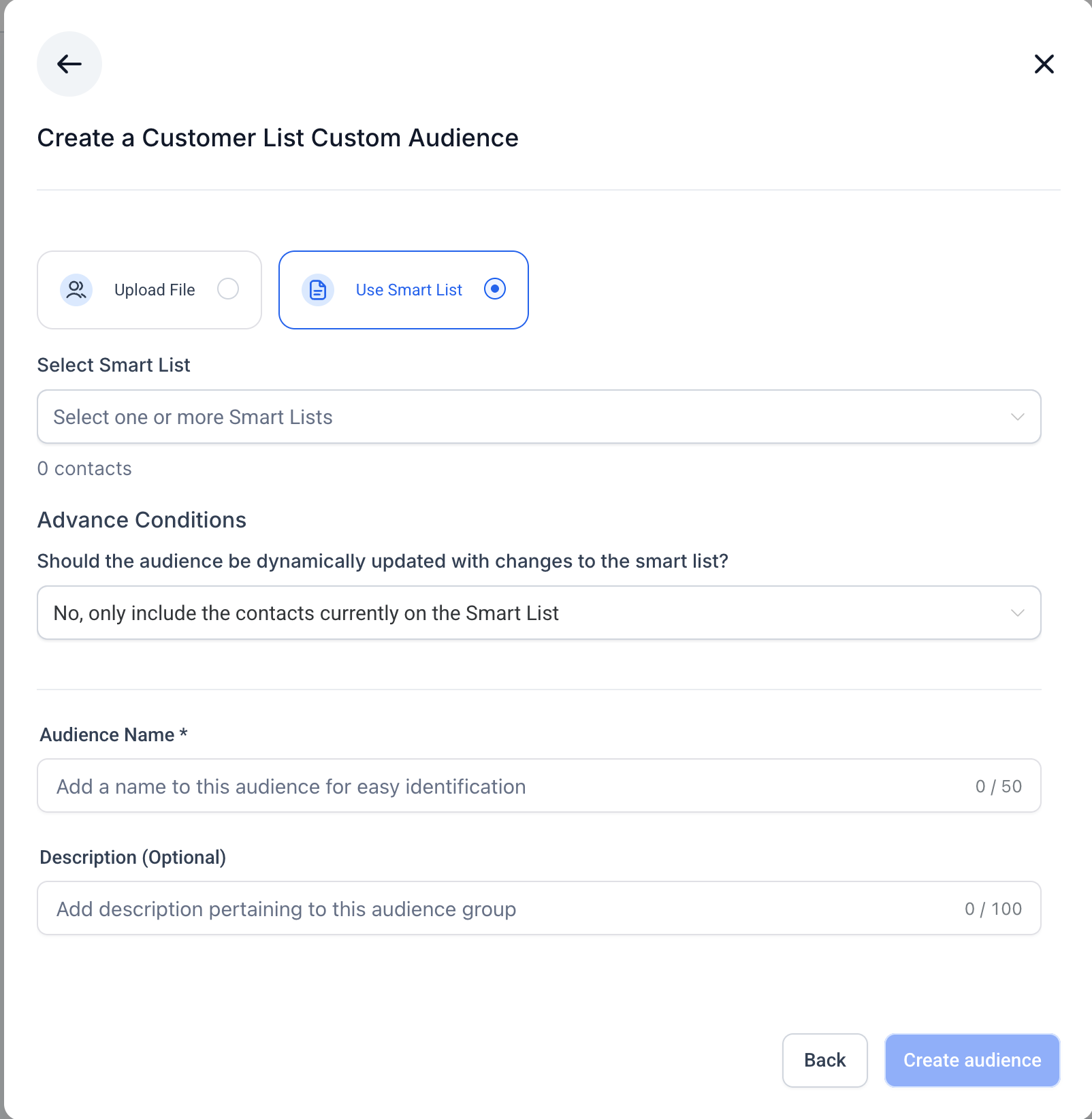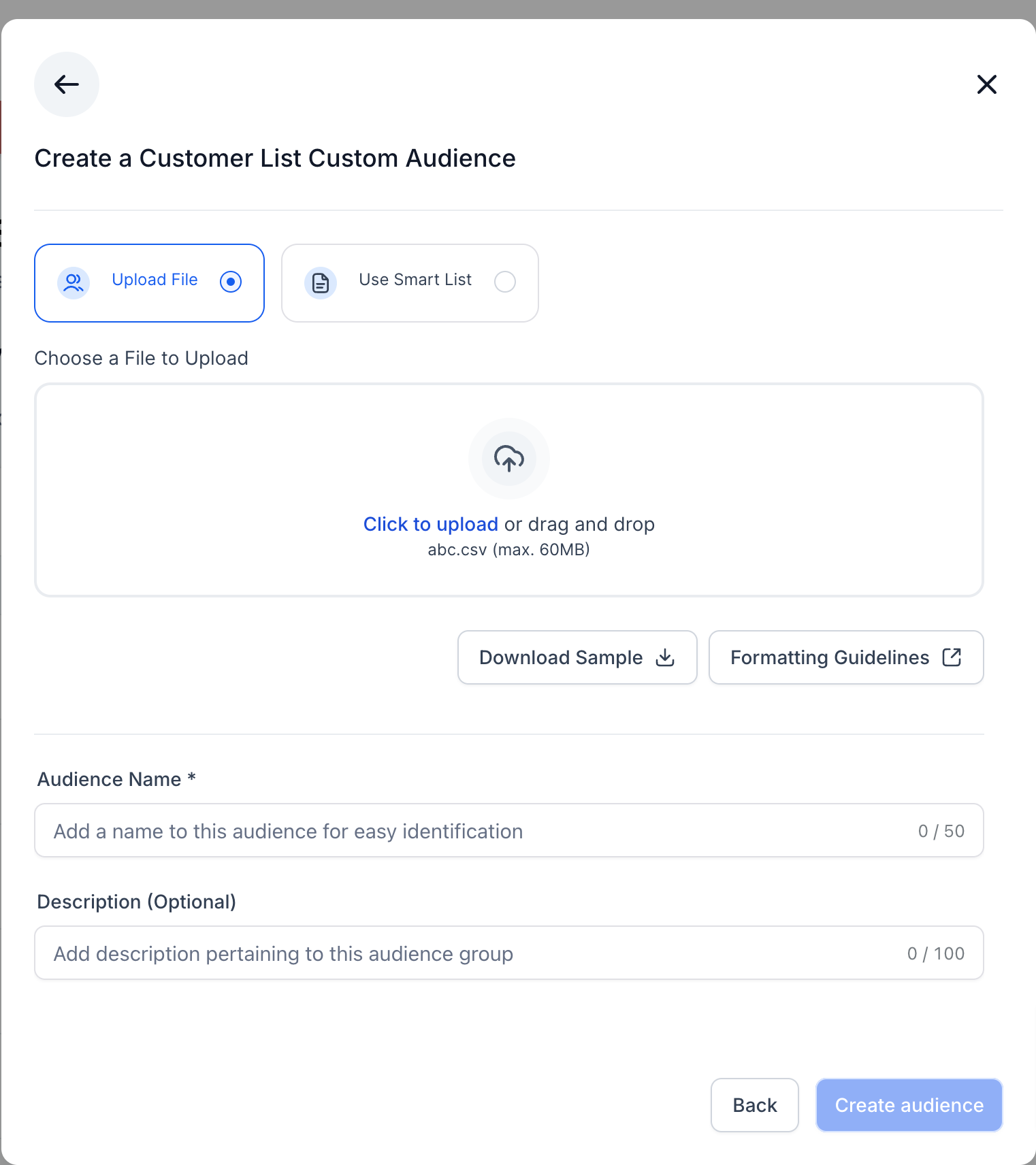 By selecting ‘Customer List’ as the custom audience source from the first stepper dialog, users can choose CSV Upload or Smart List and proceed to define audience specifics in the second step.