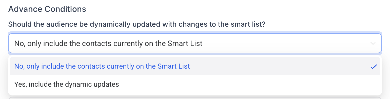 Use Smart Lists → StaticCreate the audience from an existing HighLevel Smart List and freeze it at creation time.Includes only contacts present at creation; does not update later.
