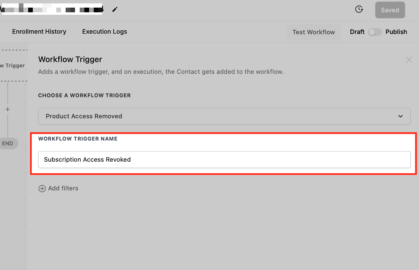 Navigate to the automation or workflow settings in your CRM platform. Create a new workflow from scratch or select the existing workflow where you want to implement the "Product Access Removed" trigger.