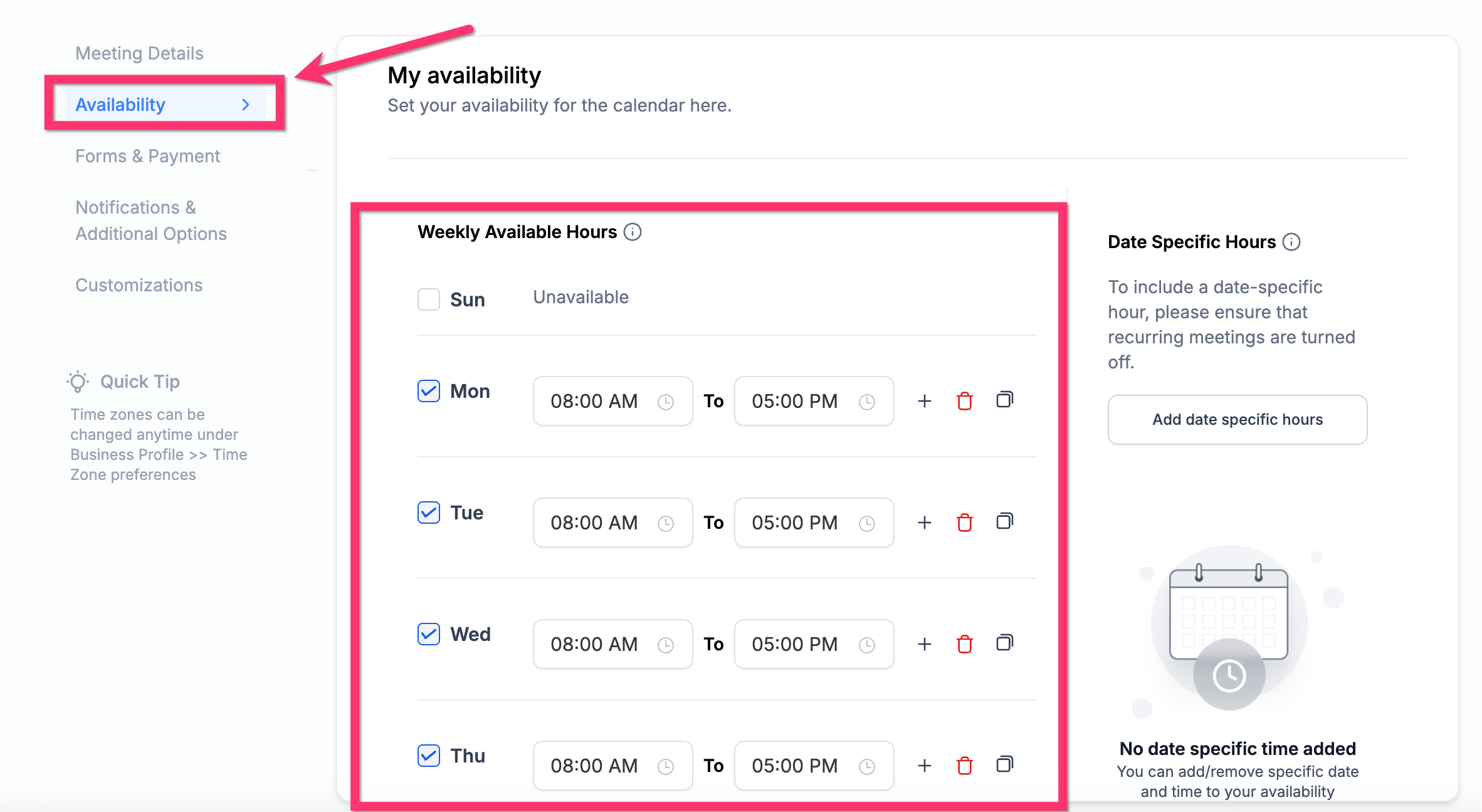 - For example, if your calendar availability is set from 10 AM to 12 PM and 6 PM to 8 PM with 60-minute meeting intervals, only the 10 AM, 11 AM, 6 PM, and 7 PM slots will be displayed, and their availability or unavailability will be shown accordingly for these four slots. If the calendar is unavailable on Saturdays, no slots will appear for that day.
