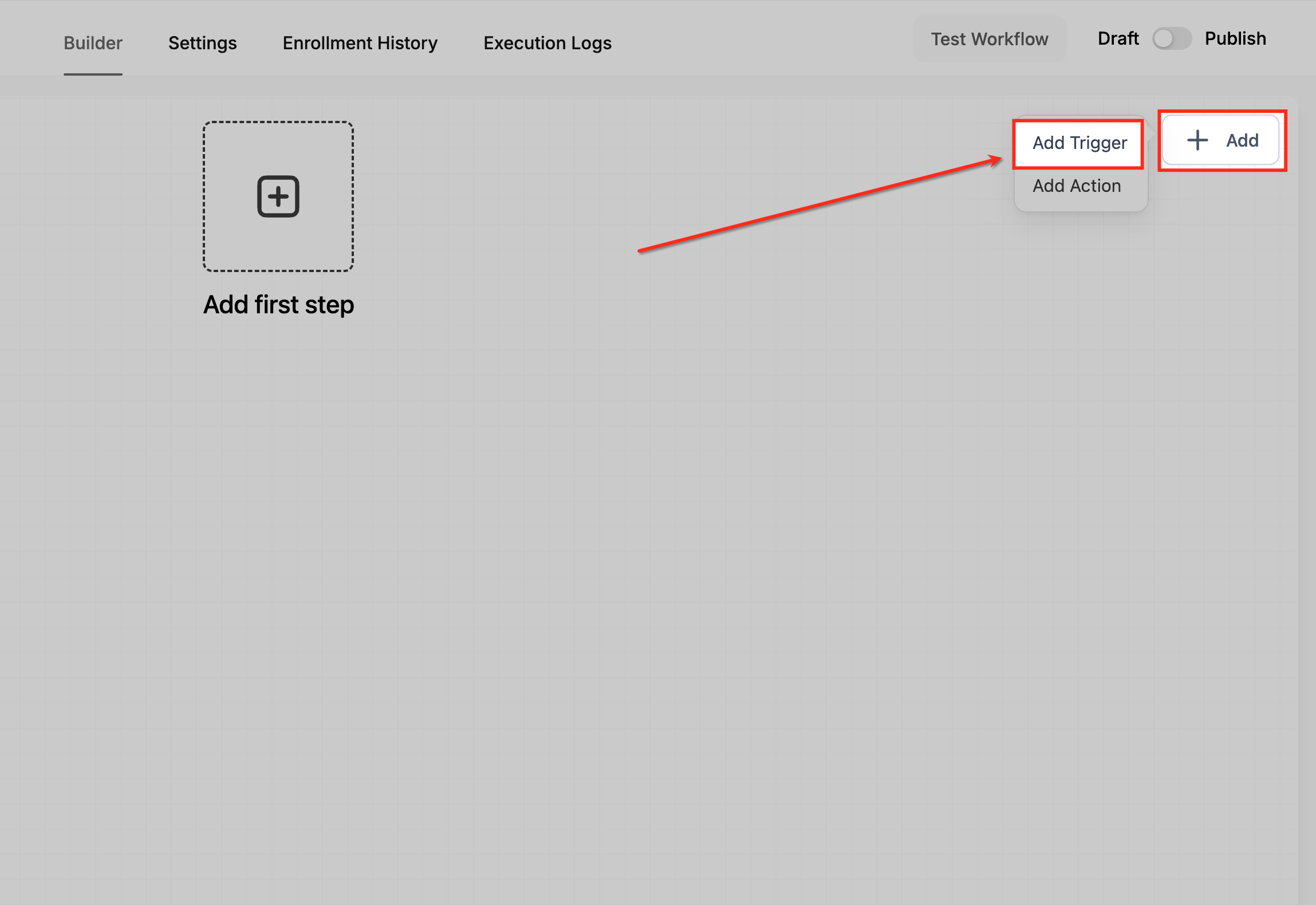 In the workflow builder, hover over + Add and select Add Trigger. This opens the trigger configuration panel on the right side of the screen.