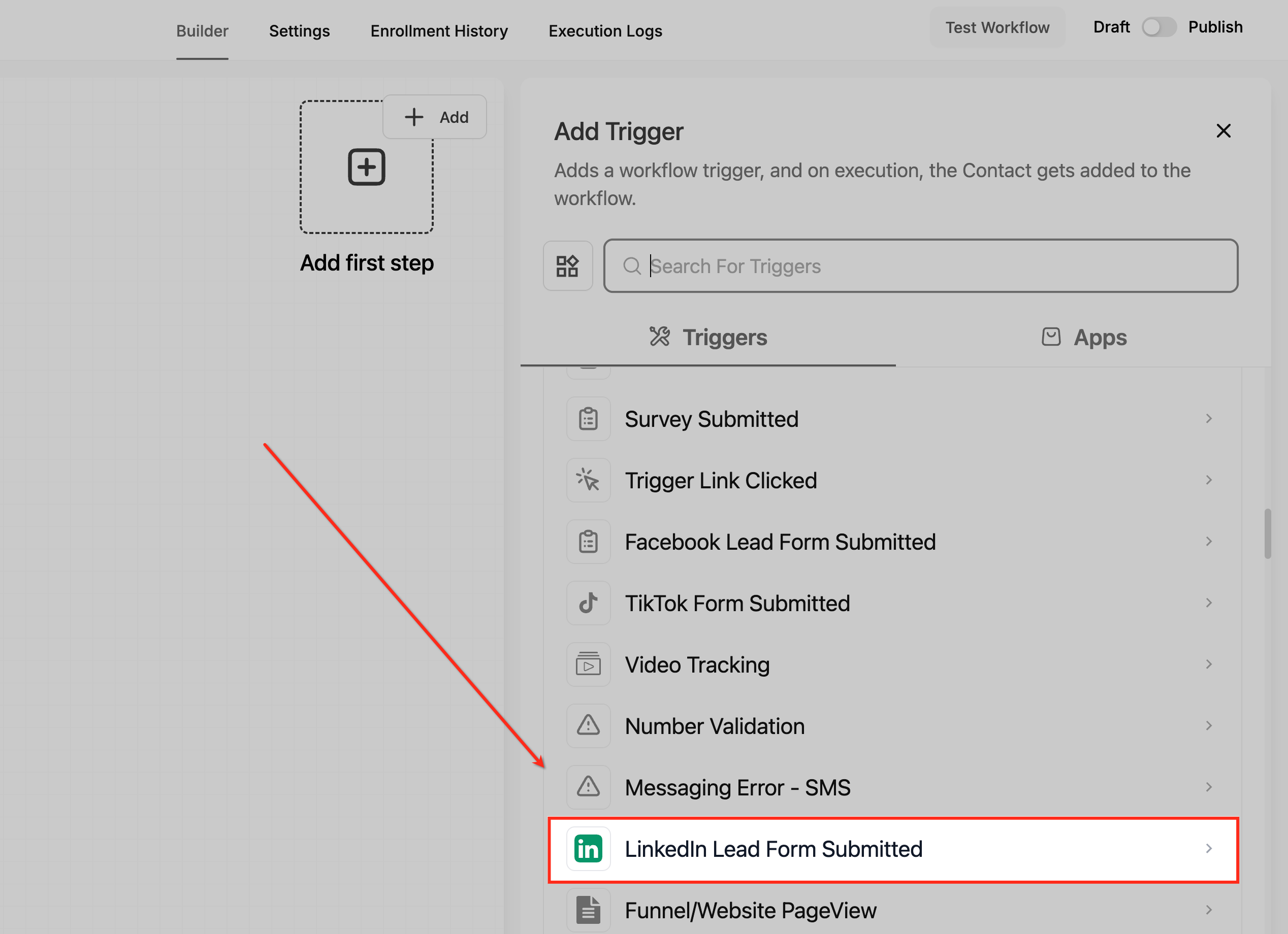 The LinkedIn Lead Form Submitted trigger enrolls a Contact into a workflow immediately after they submit a LinkedIn Lead Gen form connected to your HighLevel account. Use it to launch instant follow-ups, assign leads to reps, create opportunities, and kick off nurture automations based on where the lead came from and the data they provided.