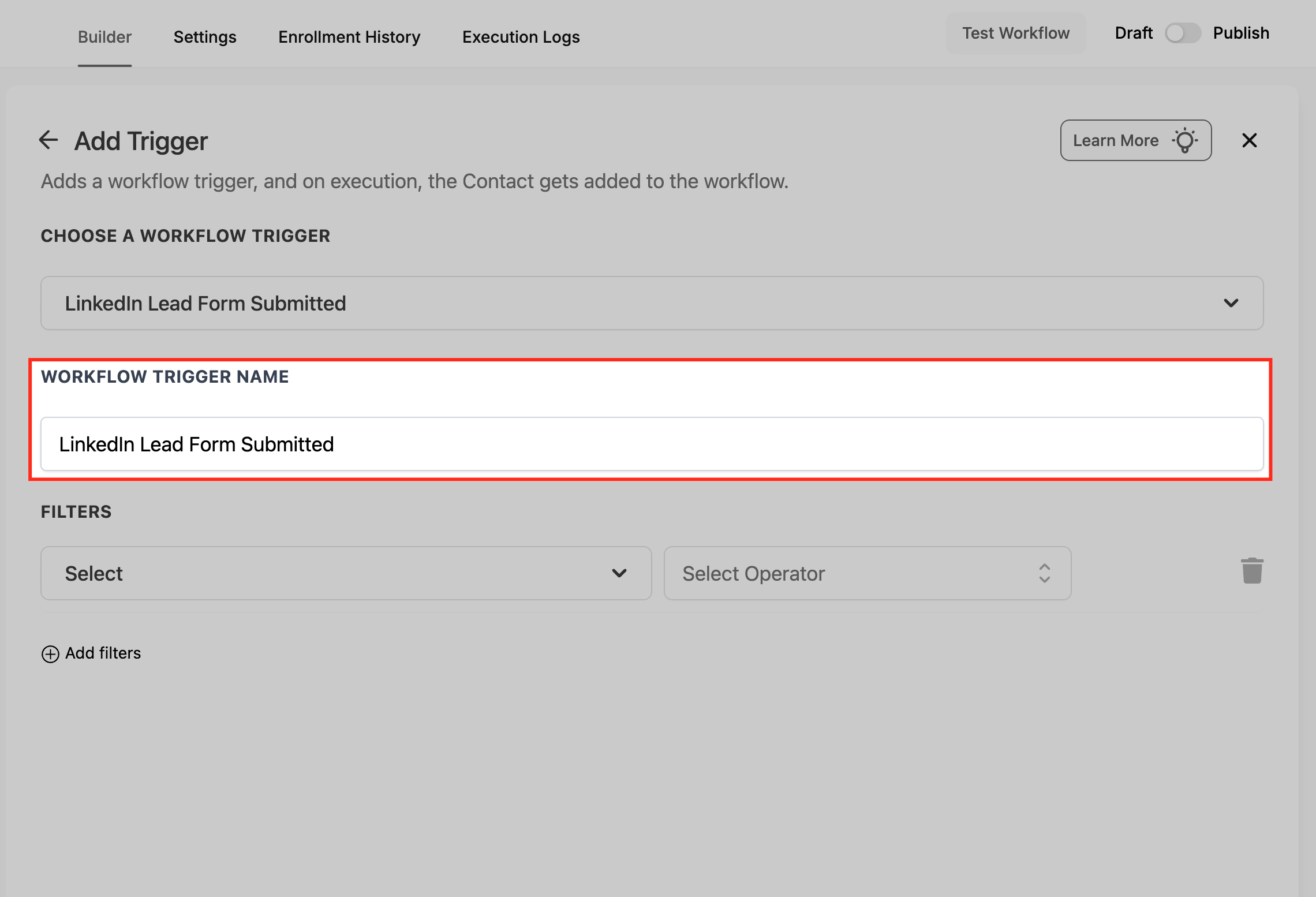 Enter a clear Workflow Trigger Name so teammates can recognize the source at a glance. Names like LinkedIn Lead Form Submitted or LinkedIn Leads — Page Scoped work well.