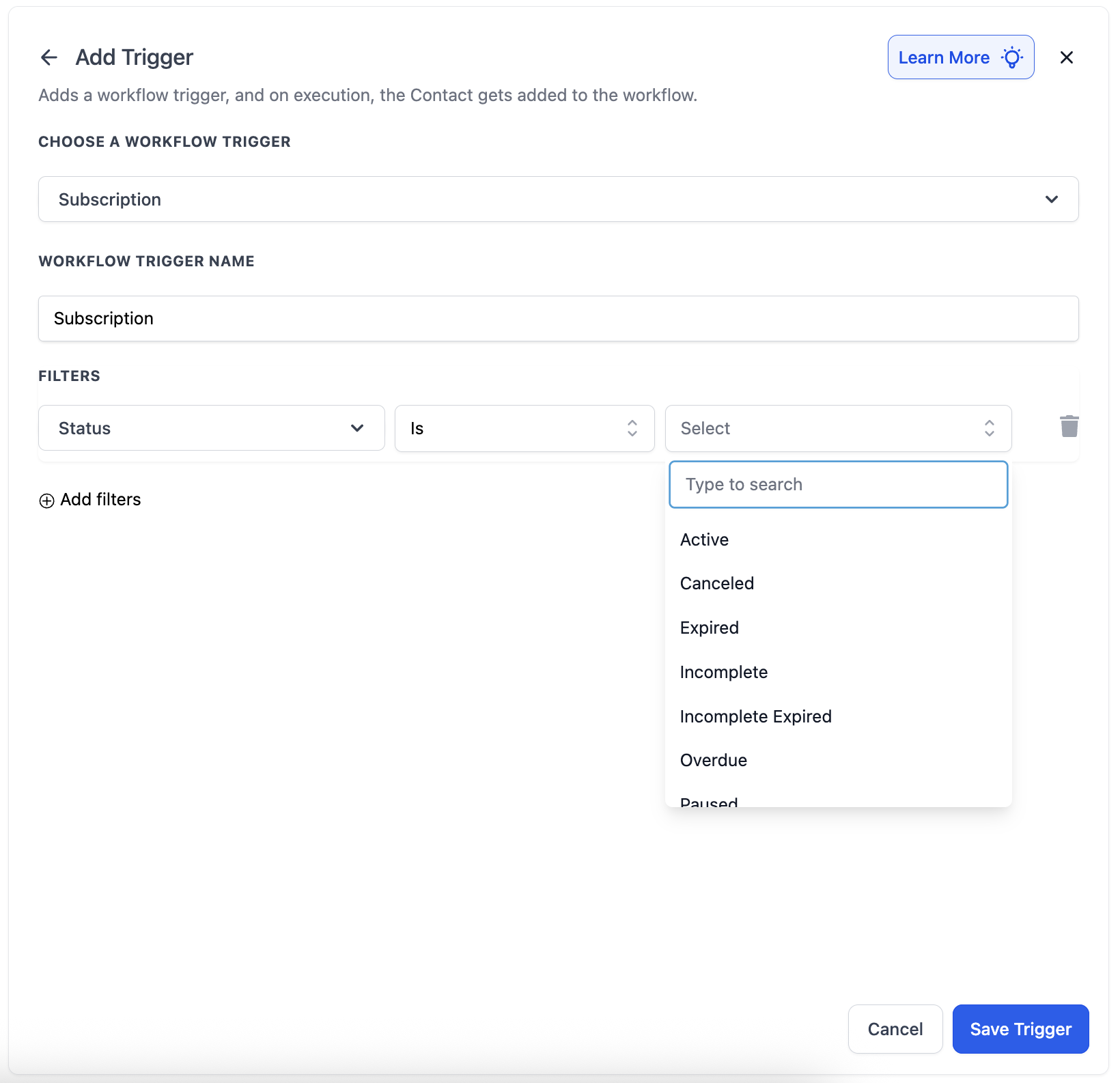 Use the Add filters option to apply conditions that narrow down which subscriptions should trigger the workflow. Filters help you specify criteria such as the product purchased or the status of the subscription (e.g., active, failed, trial). This is useful when you want the workflow to run only under certain circumstances rather than for all subscriptions.