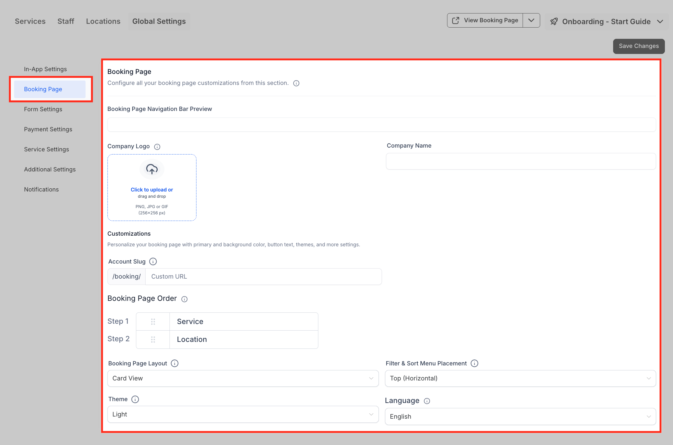 - Booking Page Order: Decide the flow of your booking page. In case of multiple locations, choose whether customers select a service first or a location first before proceeding with the booking.