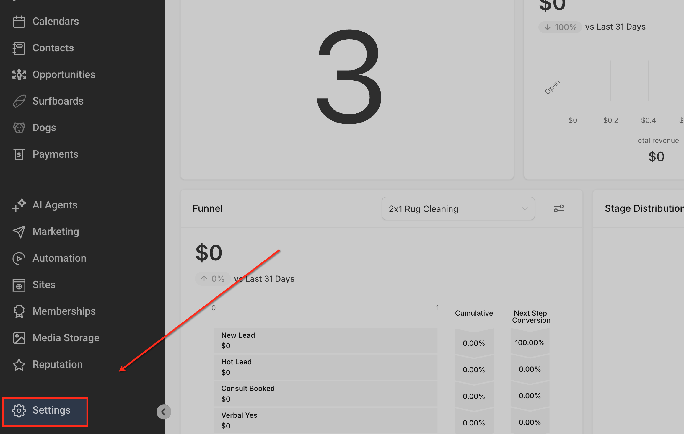 From your HighLevel dashboard, click Settings in the left sidebar as highlighted in the red box. This opens the settings panel where you can manage calendars, teams, integrations, and other account configurations necessary before creating a new Class Booking Calendar.