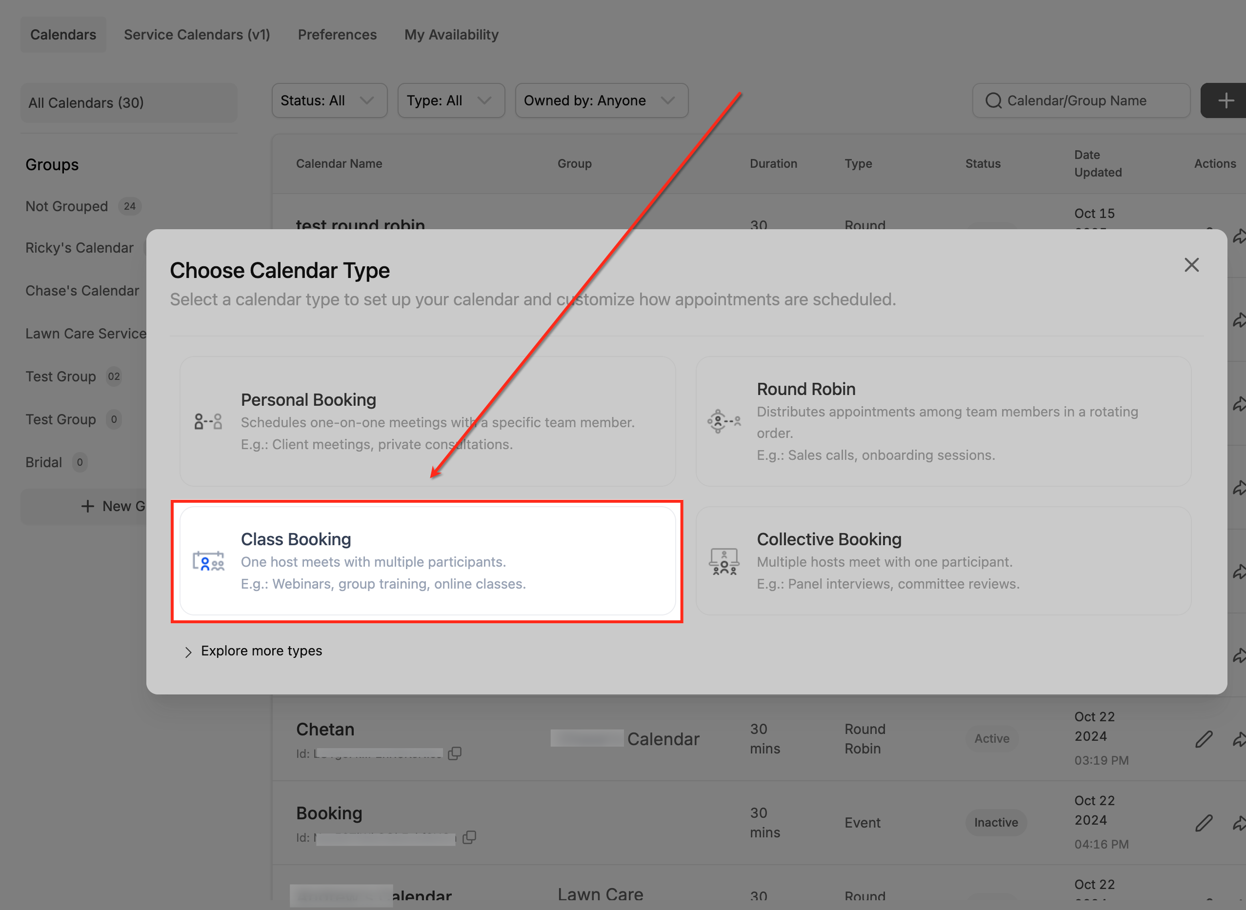 From the calendar type selection window, click Class Booking as shown in the highlighted red box. This option is for scenarios where one host meets multiple participants, such as group classes, webinars, or workshops.