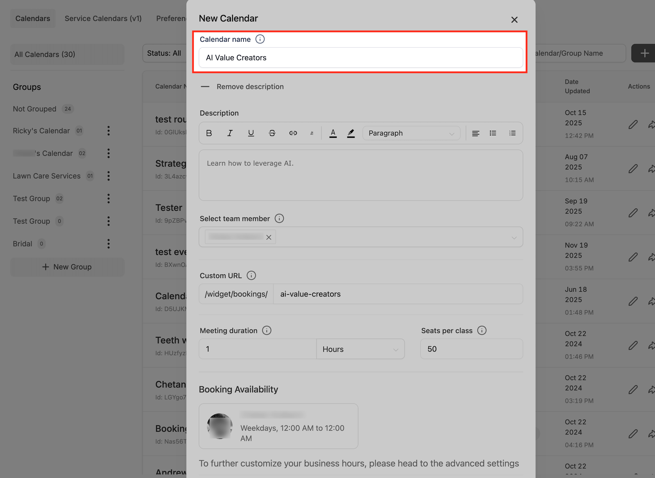- Calendar Name: Give your calendar a clear title to identify which class or service it represents.