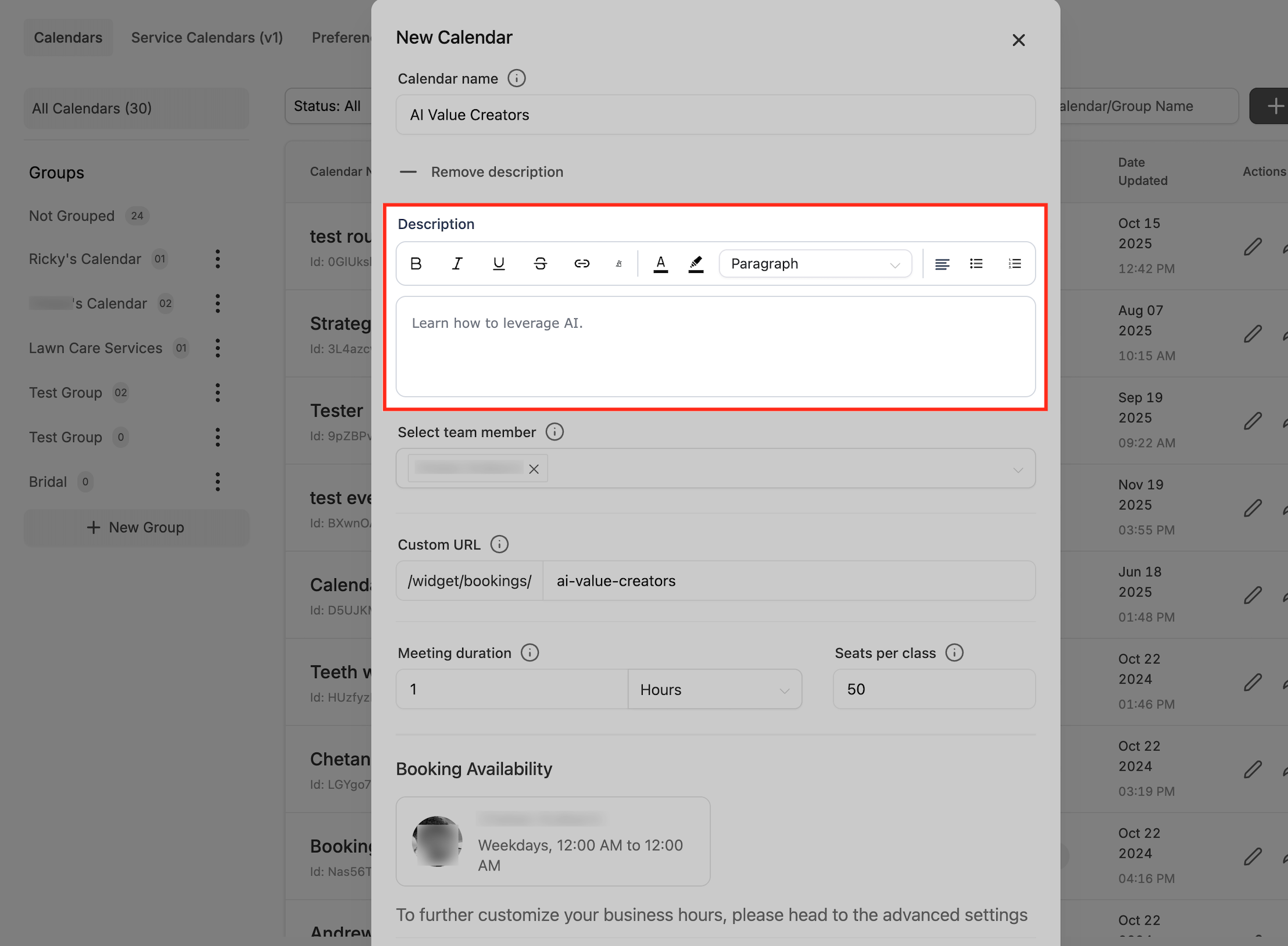 In the Description box, type a brief summary of your class or event. This description appears on your booking page and helps attendees understand what the session covers before booking.