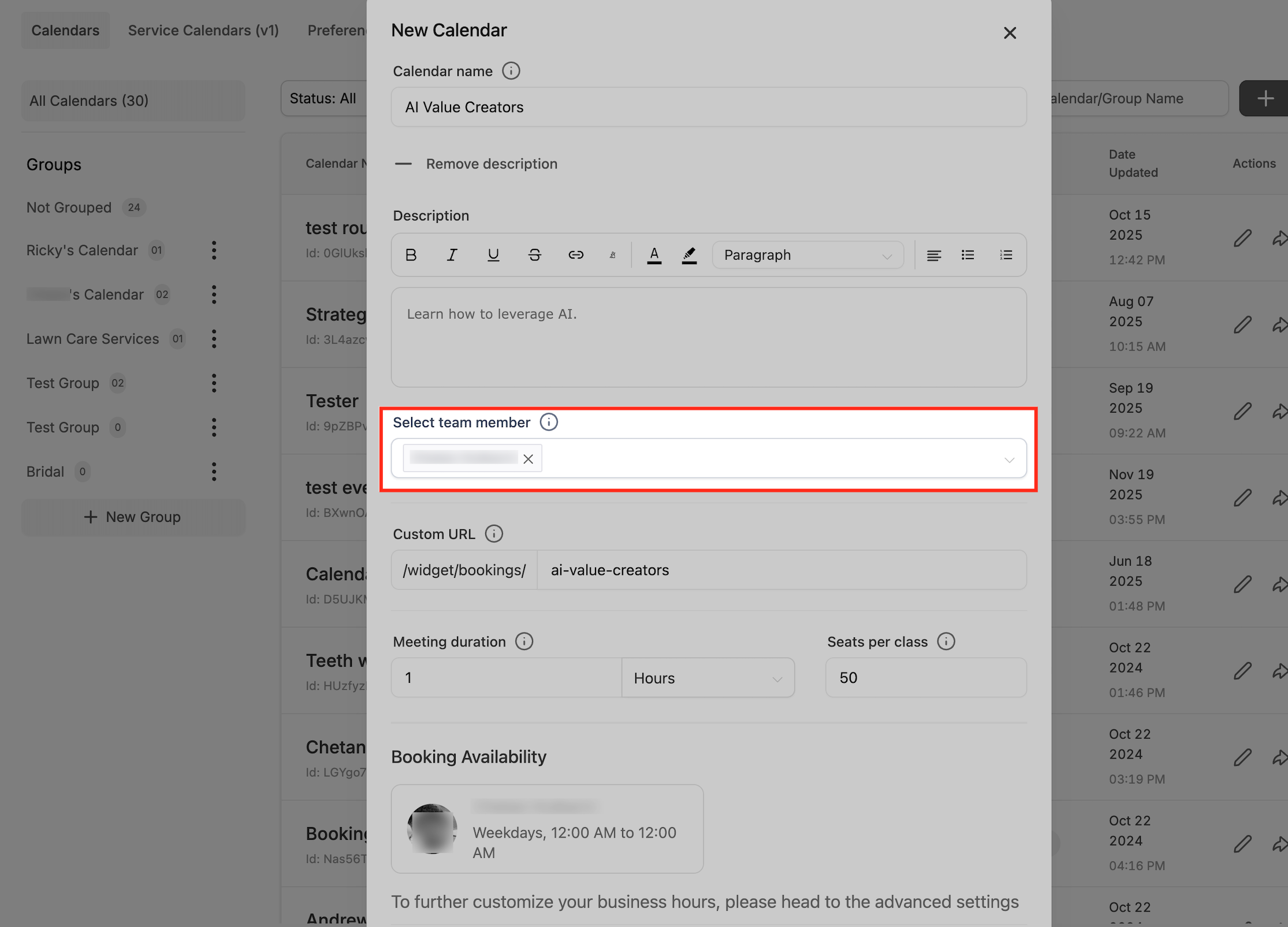 In the Select team member field, choose the instructor or host responsible for conducting the class. This links the calendar to that team member’s schedule, ensuring all bookings are automatically synced with their availability.