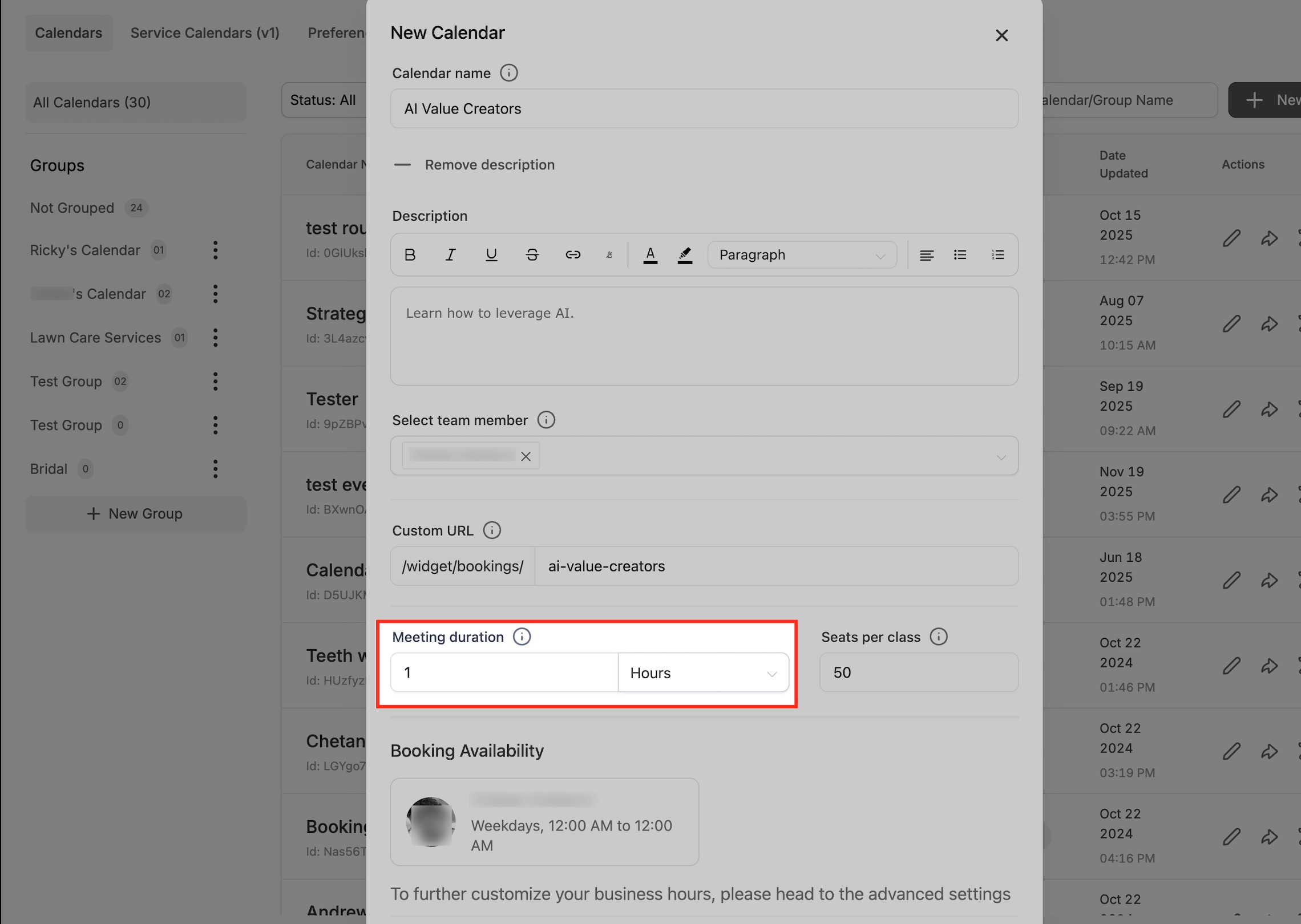 This calendar type simplifies managing recurring classes by allowing you to define seat limits, recurring schedules, and integrated payments — all within HighLevel. It reduces manual booking efforts and automates participant management.