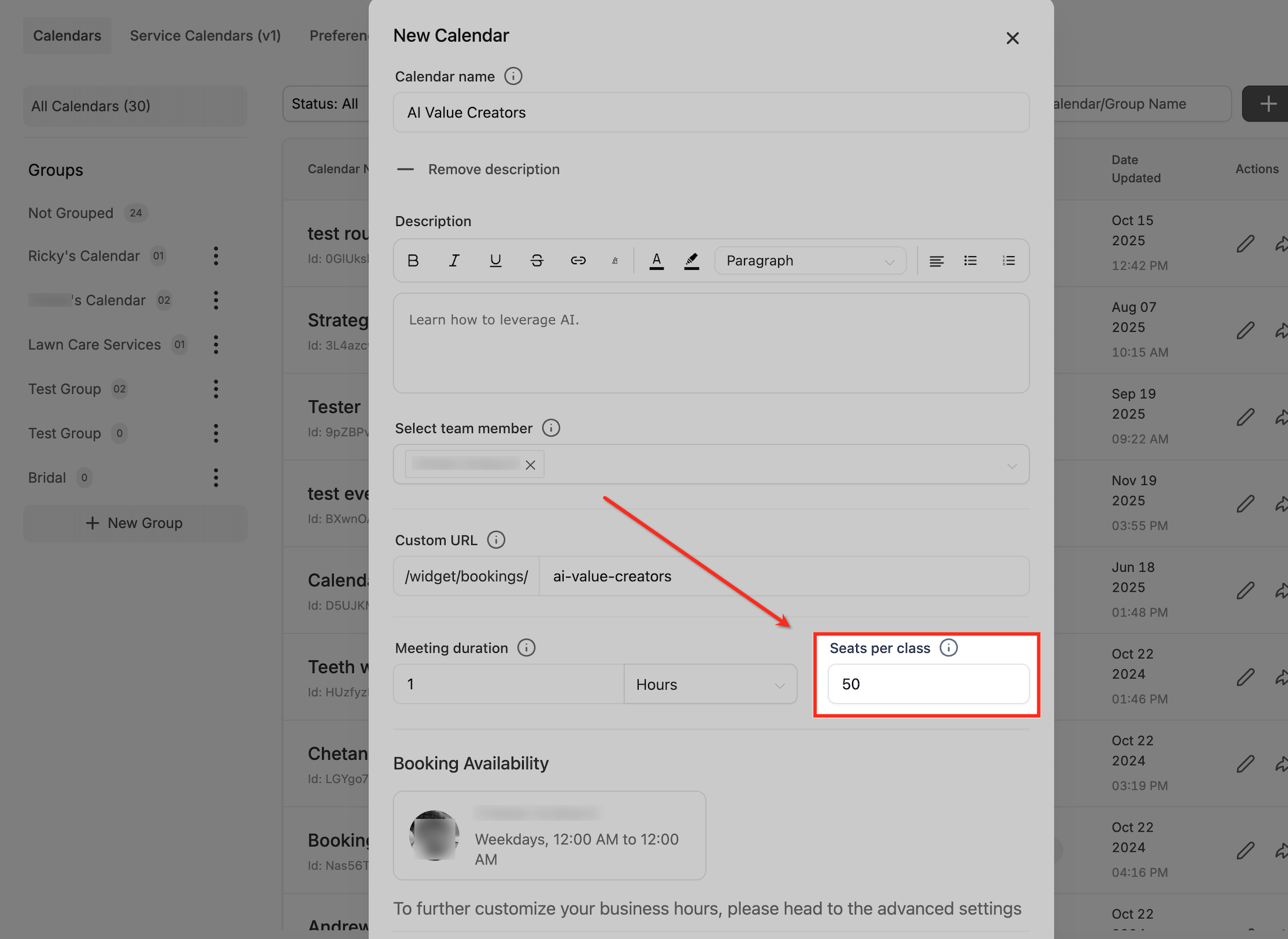 The Class Booking Calendar is a HighLevel calendar type designed for situations where a single host meets multiple attendees in the same session. It’s ideal for yoga studios, online courses, or training sessions where participants can book seats for specific dates and times.