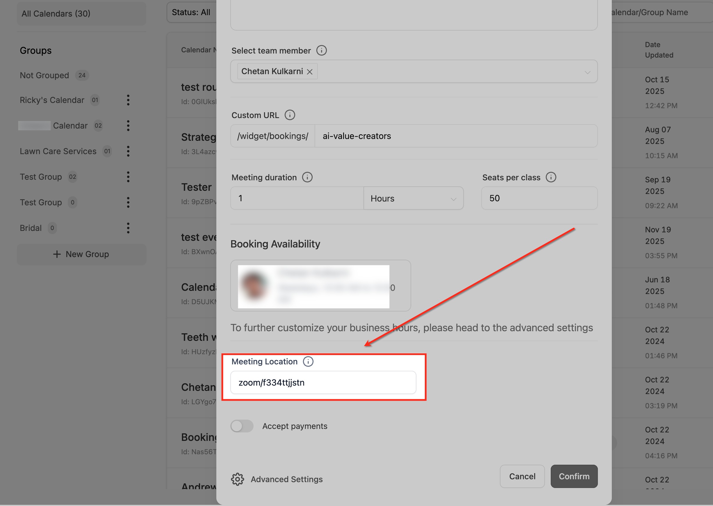 In the Meeting Location field, enter the link or address where the class will take place, such as a Zoom or Google Meet URL. This ensures attendees receive the correct meeting access details automatically in their booking confirmation. Providing this information up front avoids confusion and helps streamline the attendee experience.