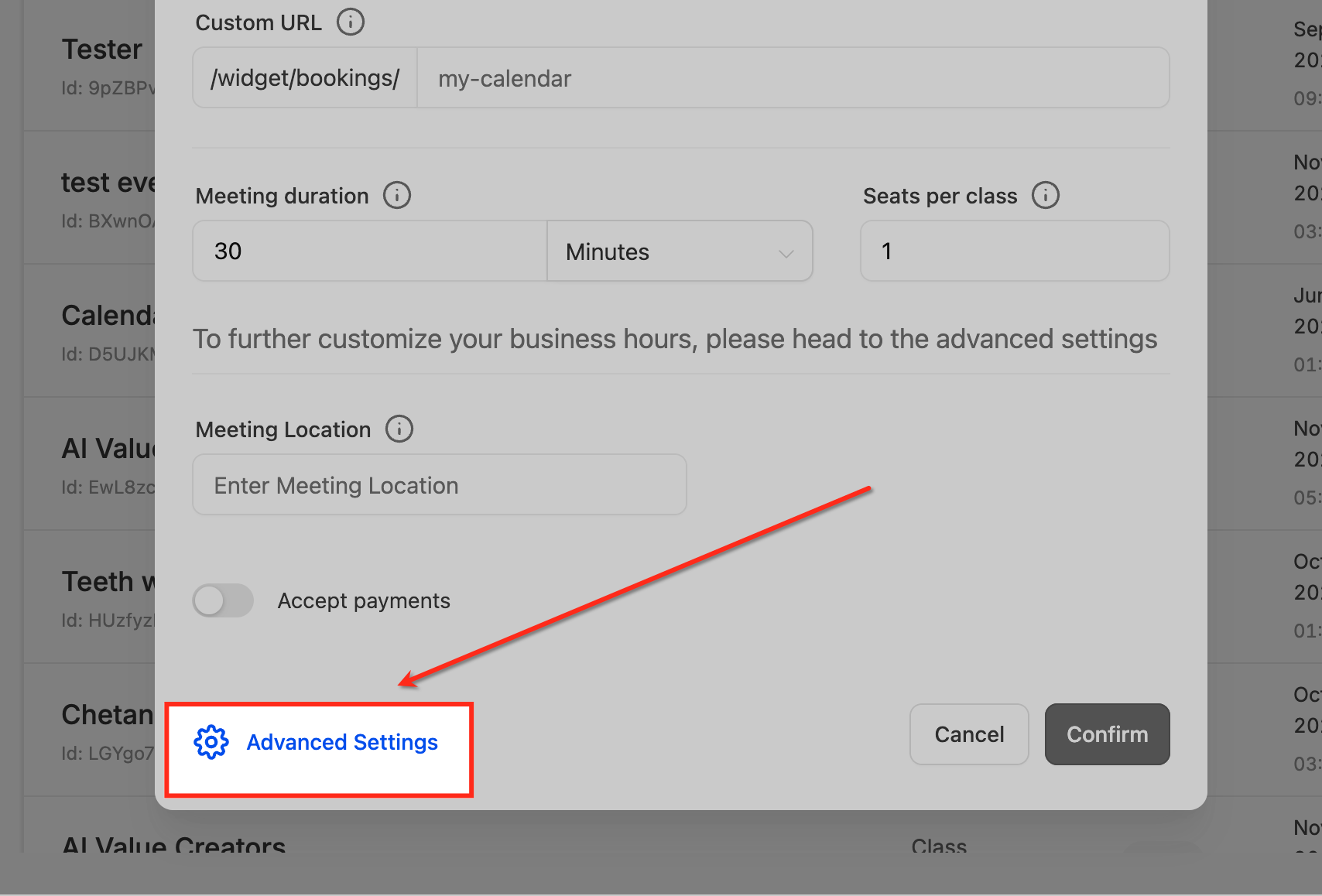 Click Advanced Settings at the bottom of the calendar setup window, as highlighted in the red box. This opens additional configuration options for your calendar, allowing you to fine-tune availability, notifications, and customization settings. Accessing this section ensures your class booking calendar aligns with your preferred schedule and branding requirements.