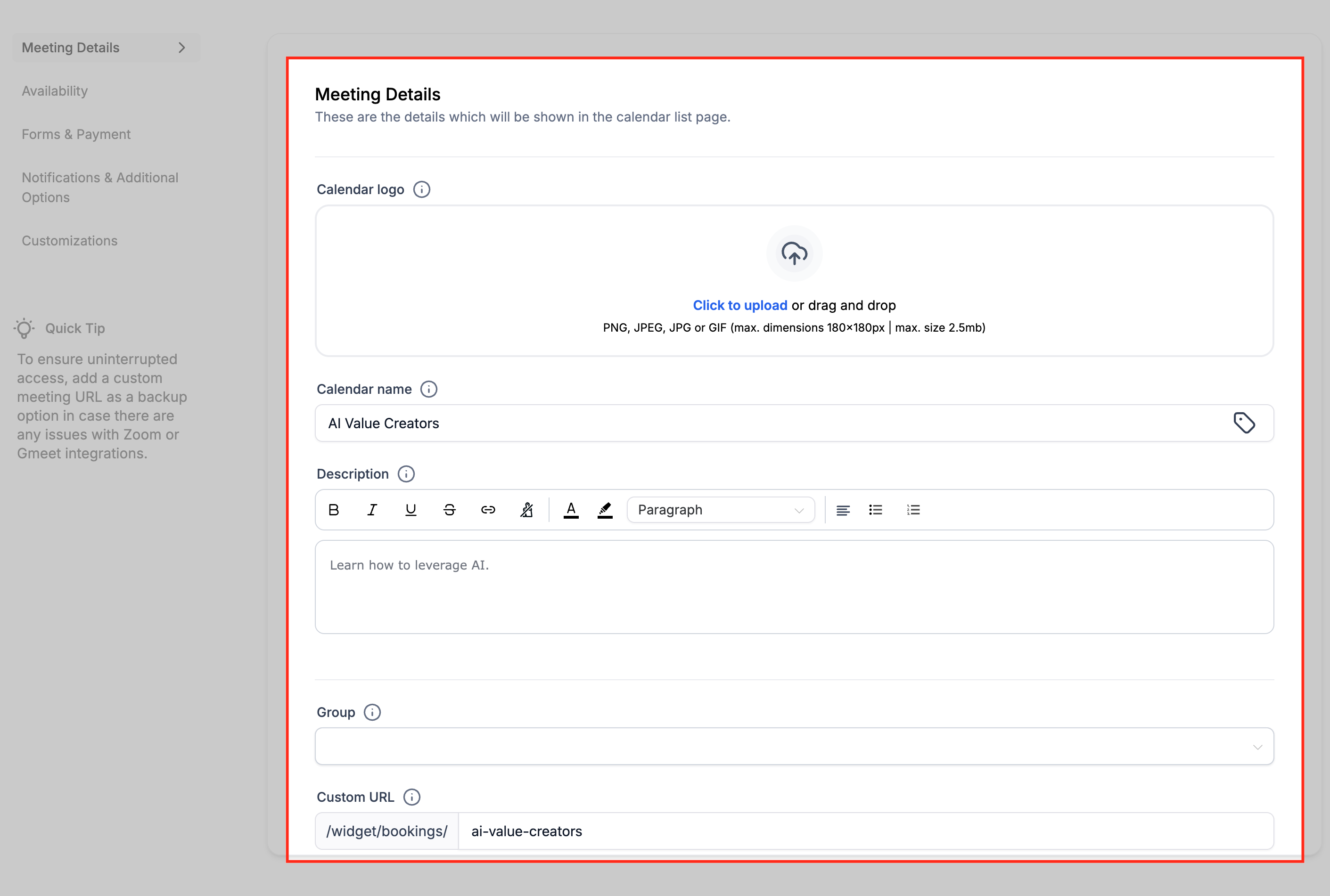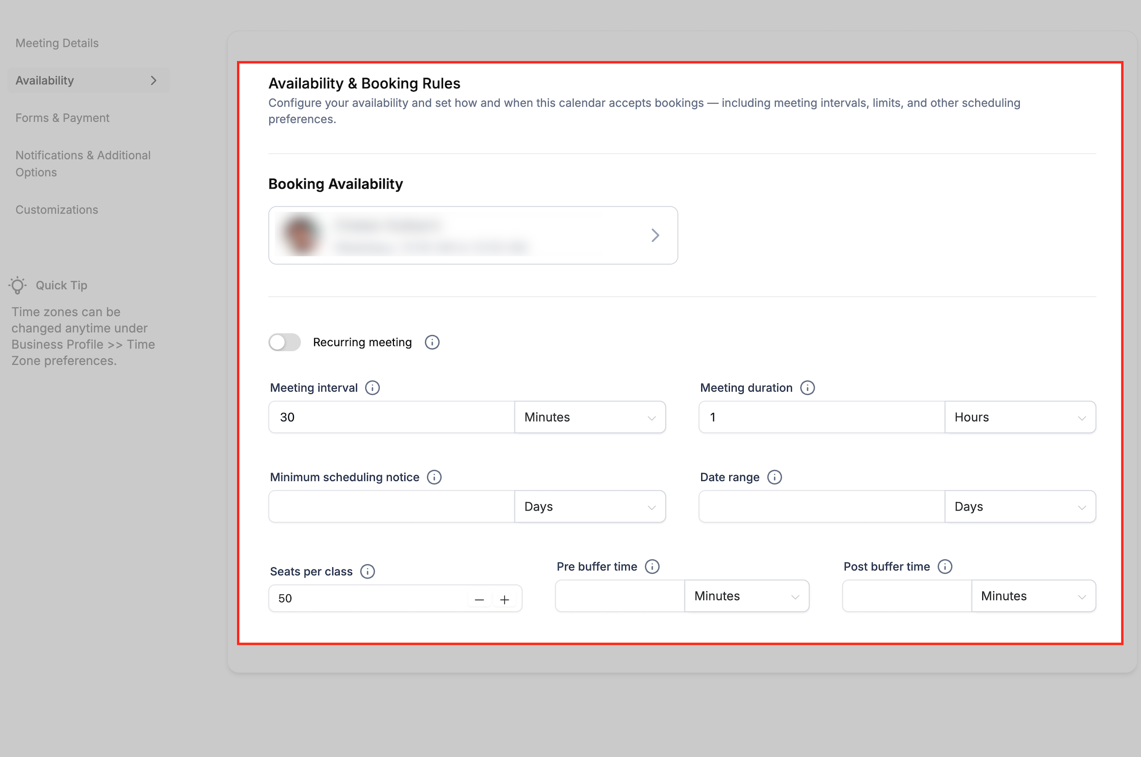 The Meeting Details section lets you define the key information displayed to users on your class booking page. Each element here helps personalize and organize your calendar for a professional appearance.