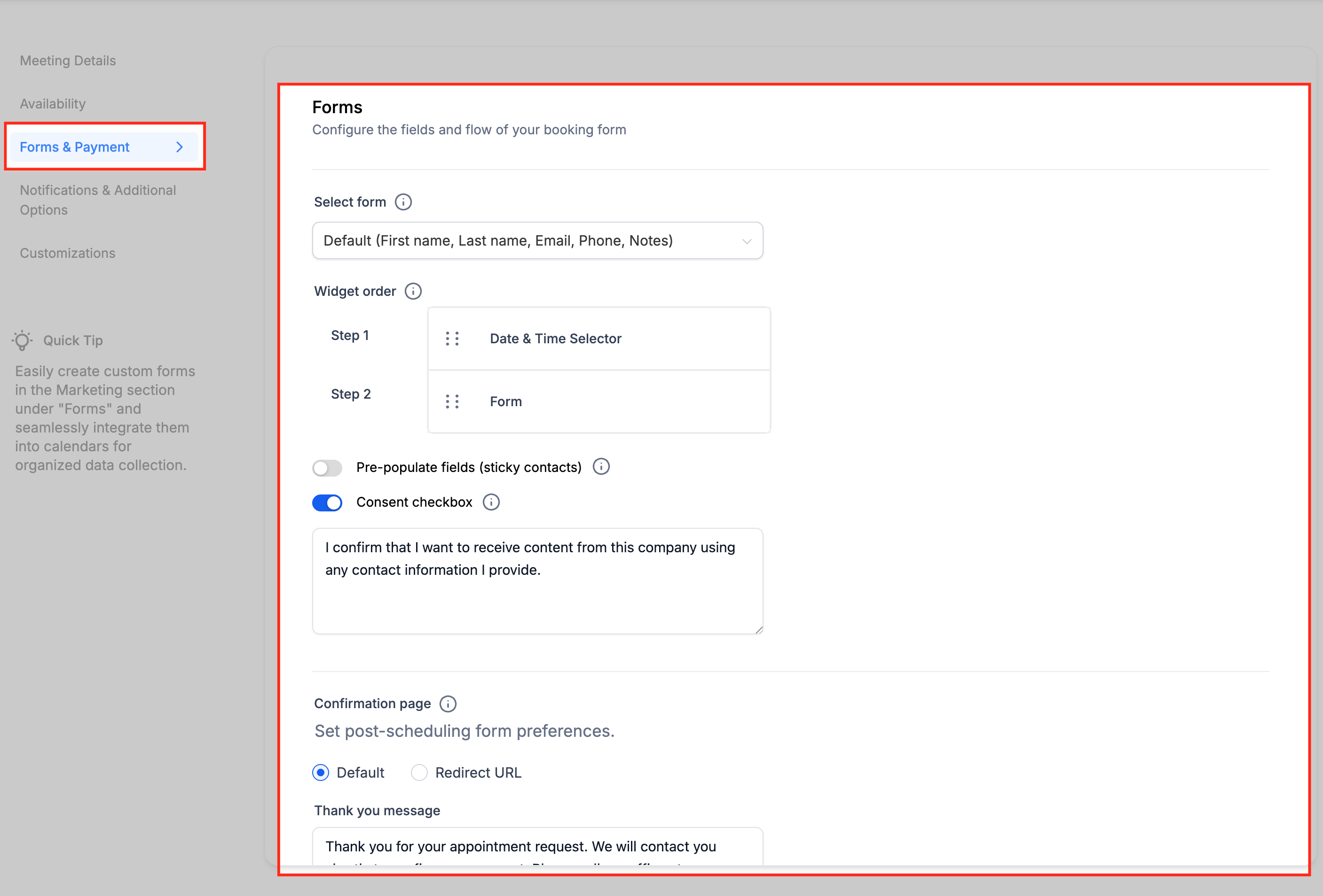 - Confirmation Page: Choose between a default thank-you message or a redirect URL for post-booking.