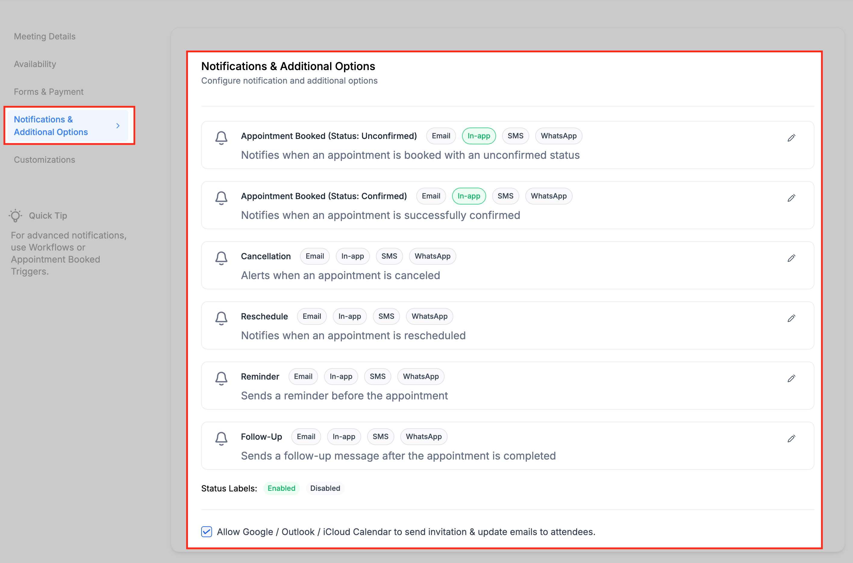 - Appointment Notifications: Configure alerts for when bookings are created, confirmed, rescheduled, or canceled via email, SMS, WhatsApp, or in-app.
