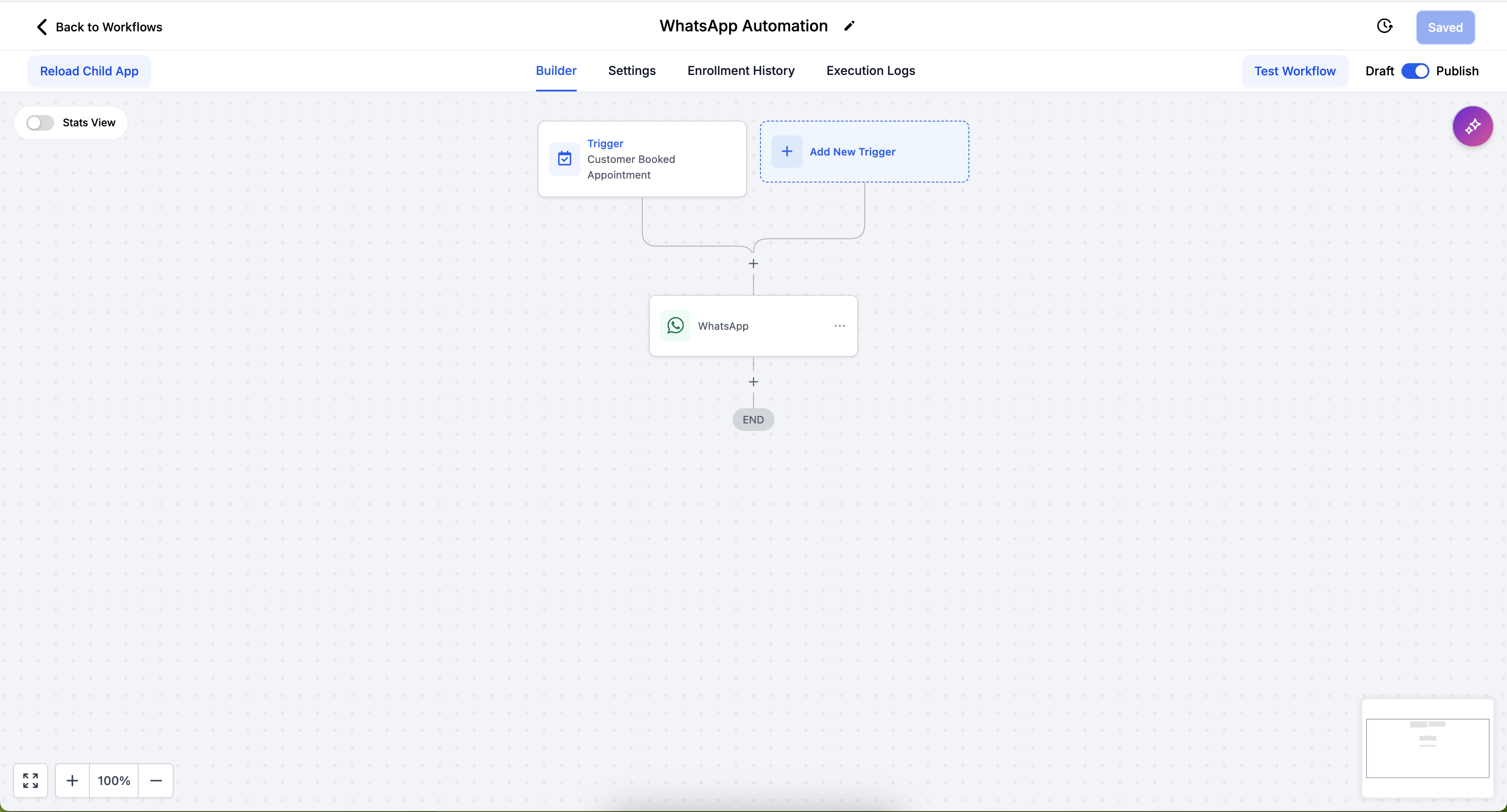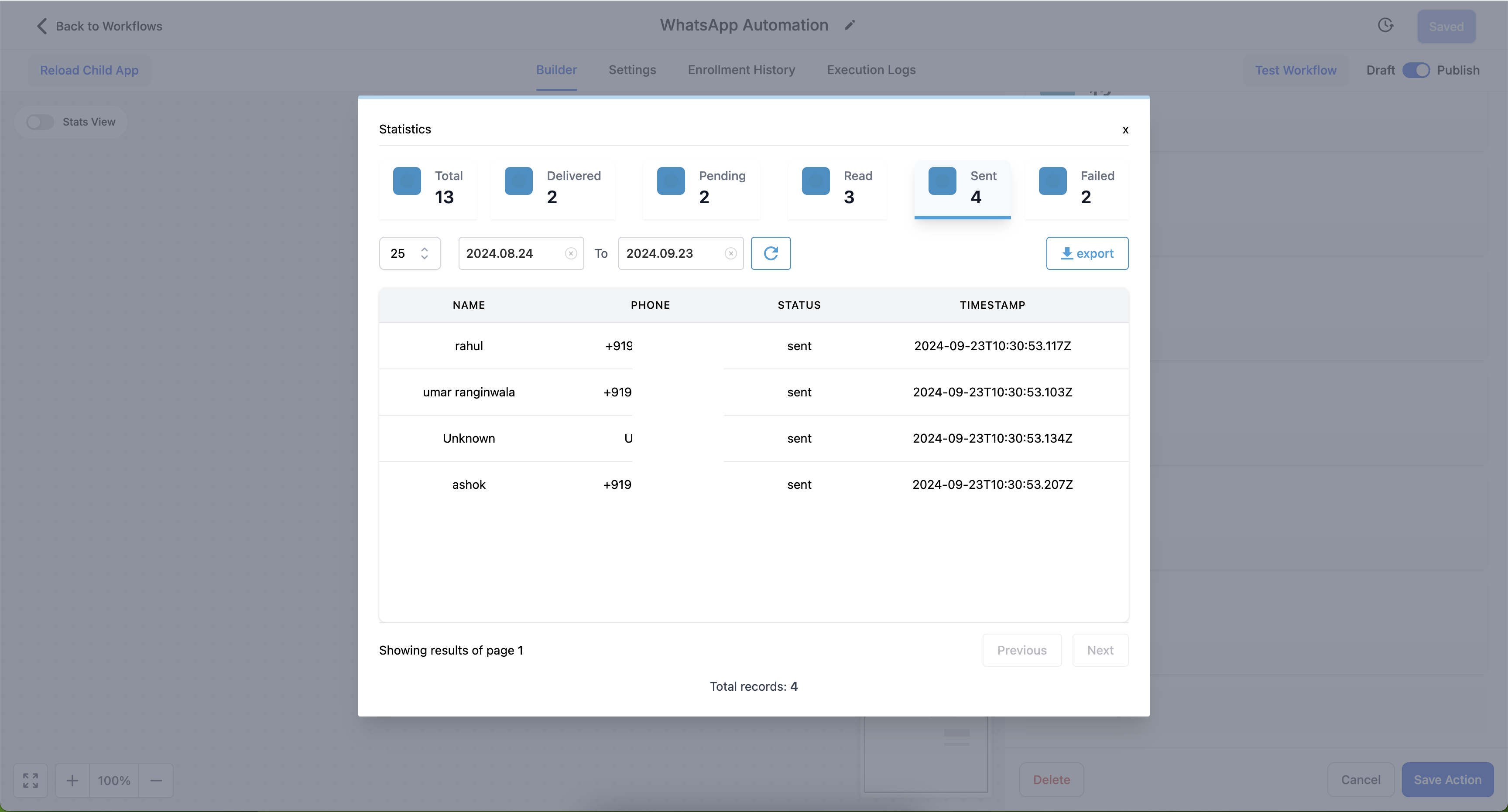 This detailed breakdown allows users to track the performance and effectiveness of their WhatsApp communication within the workflow.