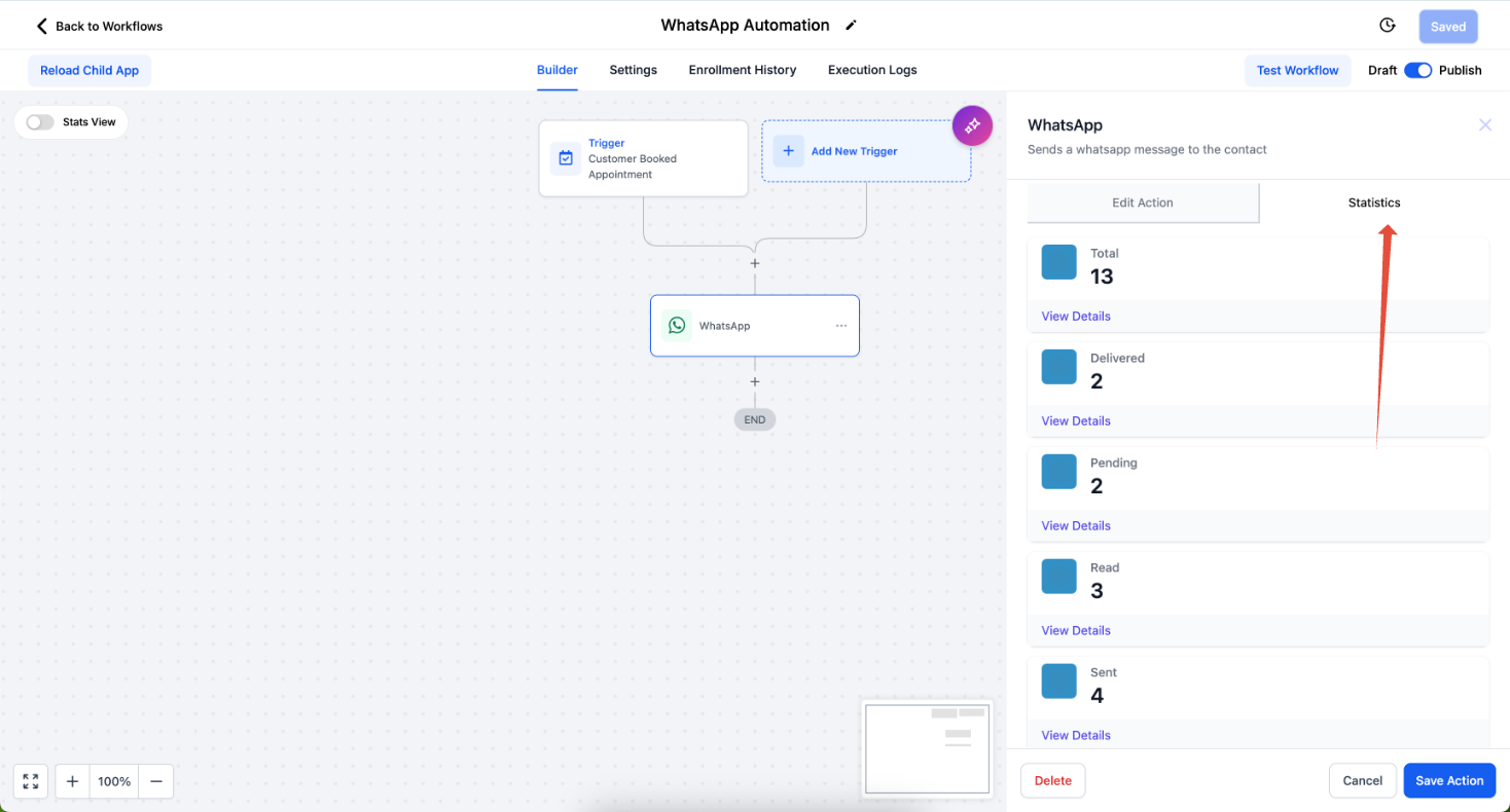 Step 2: Click on the WhatsApp Action > Statistics