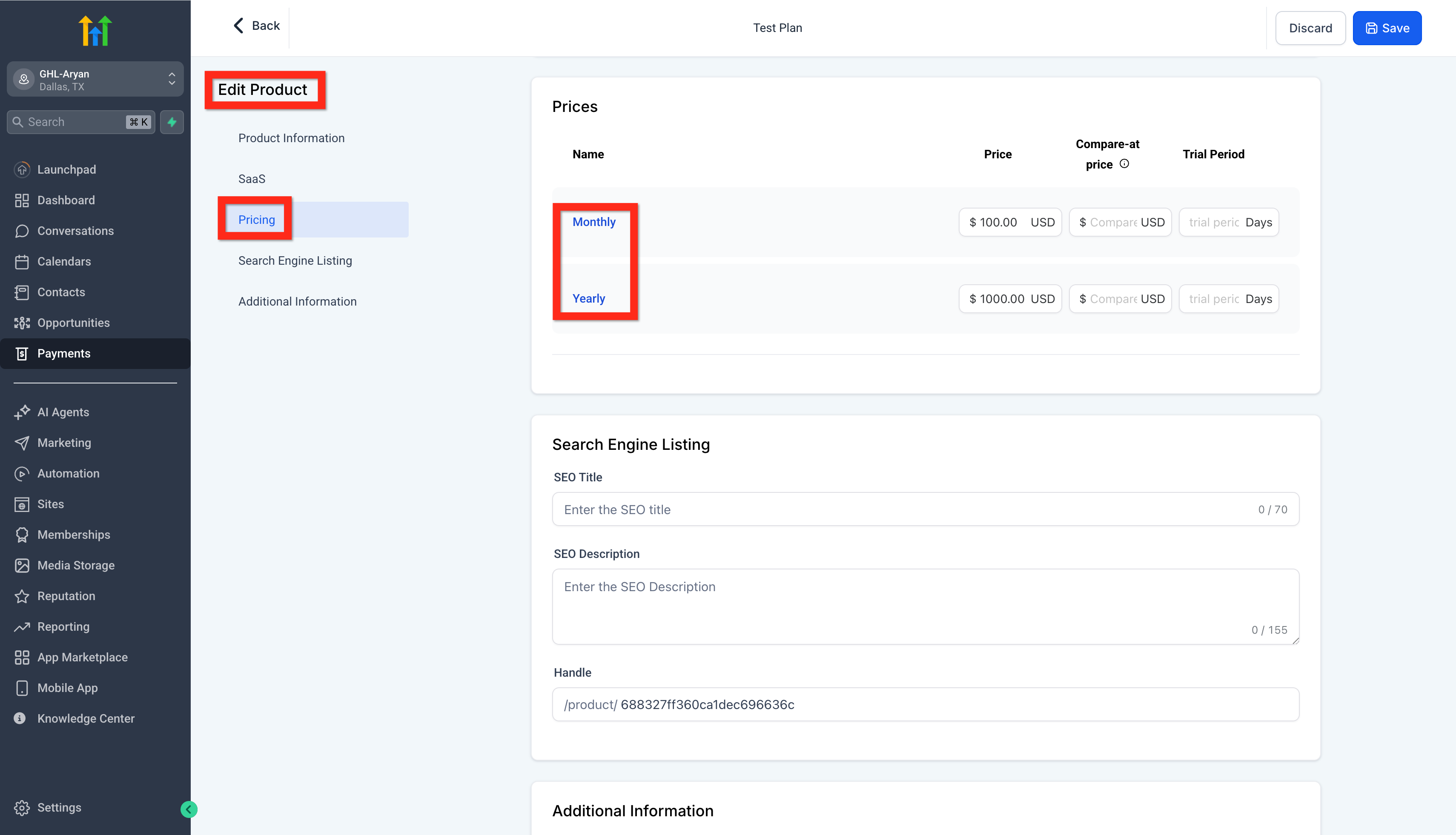 - Scroll to the Pricing section to setup the monthly & annual prices, and corresponding trial periods.