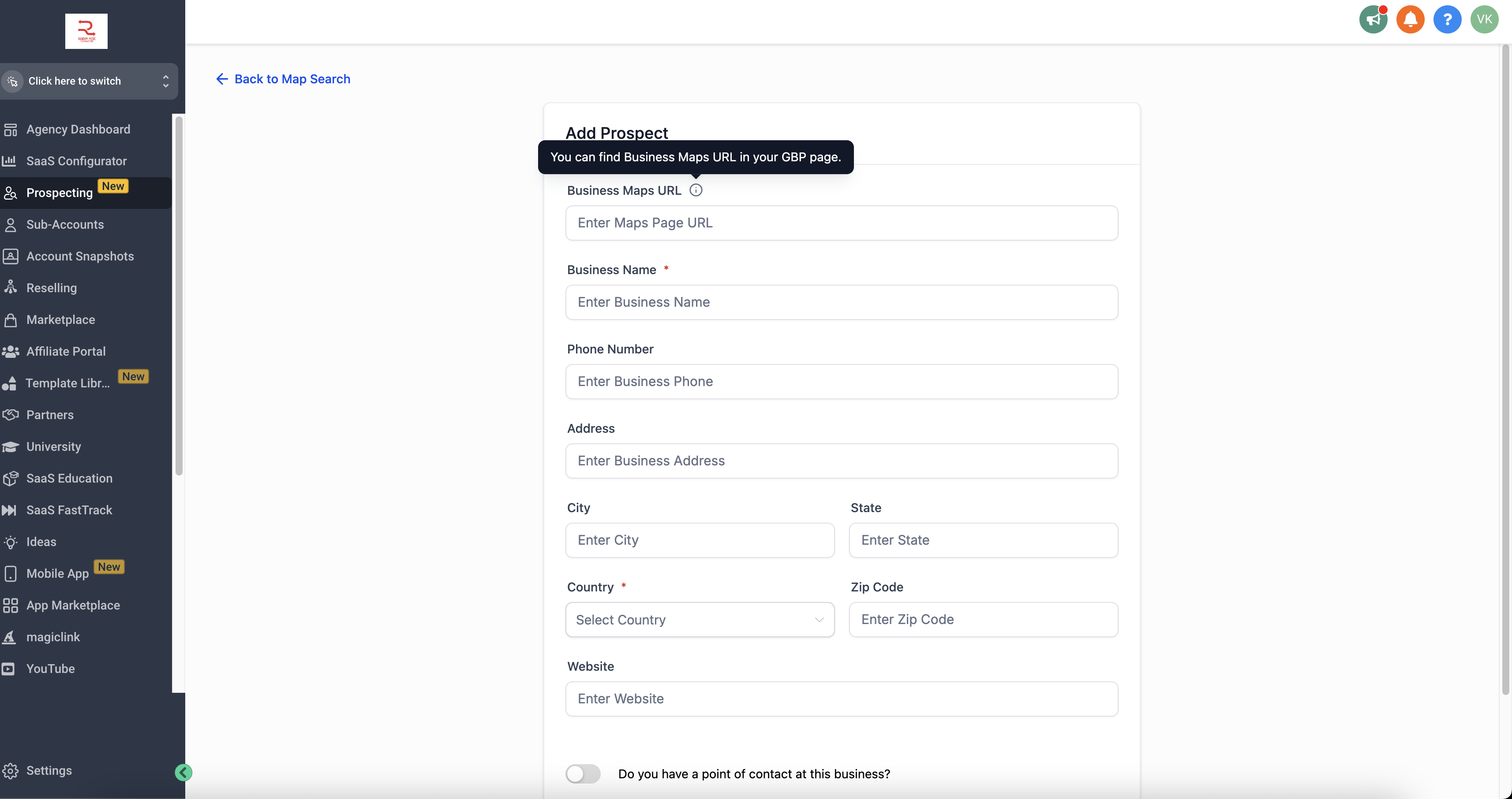 - Open the Prospecting Tool in your GoHighLevel account.