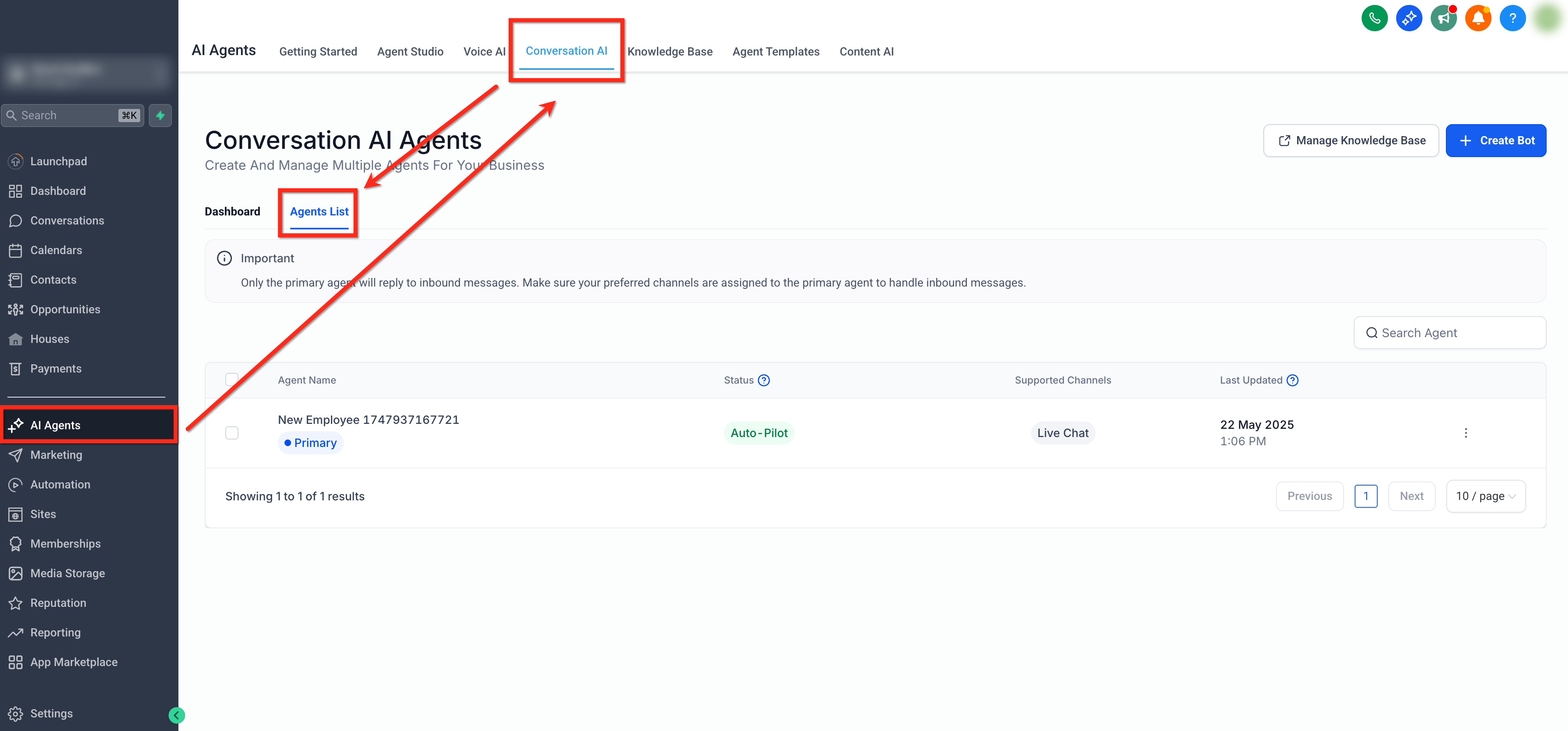 Navigate to AI Agents > Conversation AI > Agents List. Open the agent you would like to edit.