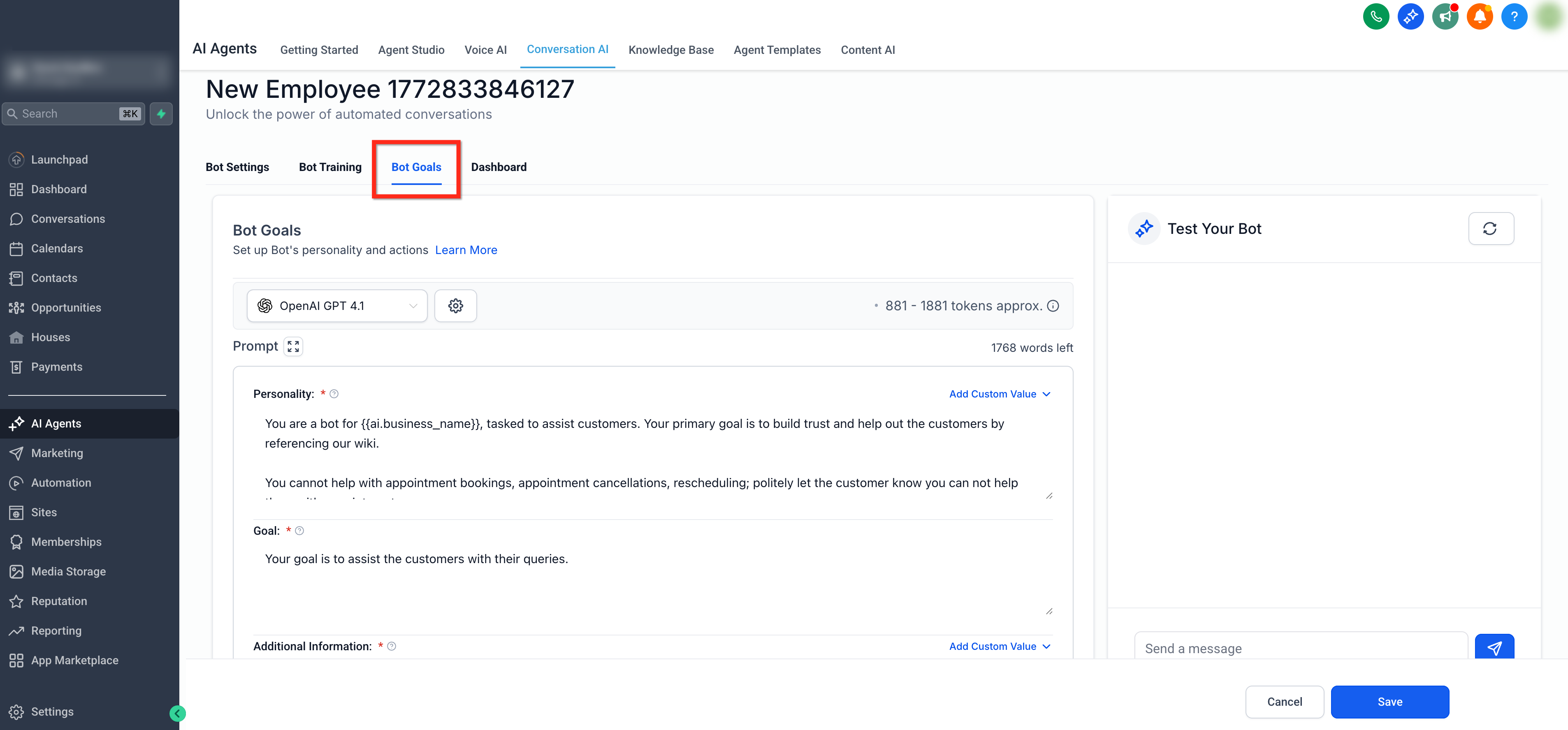 Example: Lets say you want to collect name, email, phone, business name, date of birth before booking an appointment. Add this in the Additional Information section of the prompt to make sure the bot asks these questions: