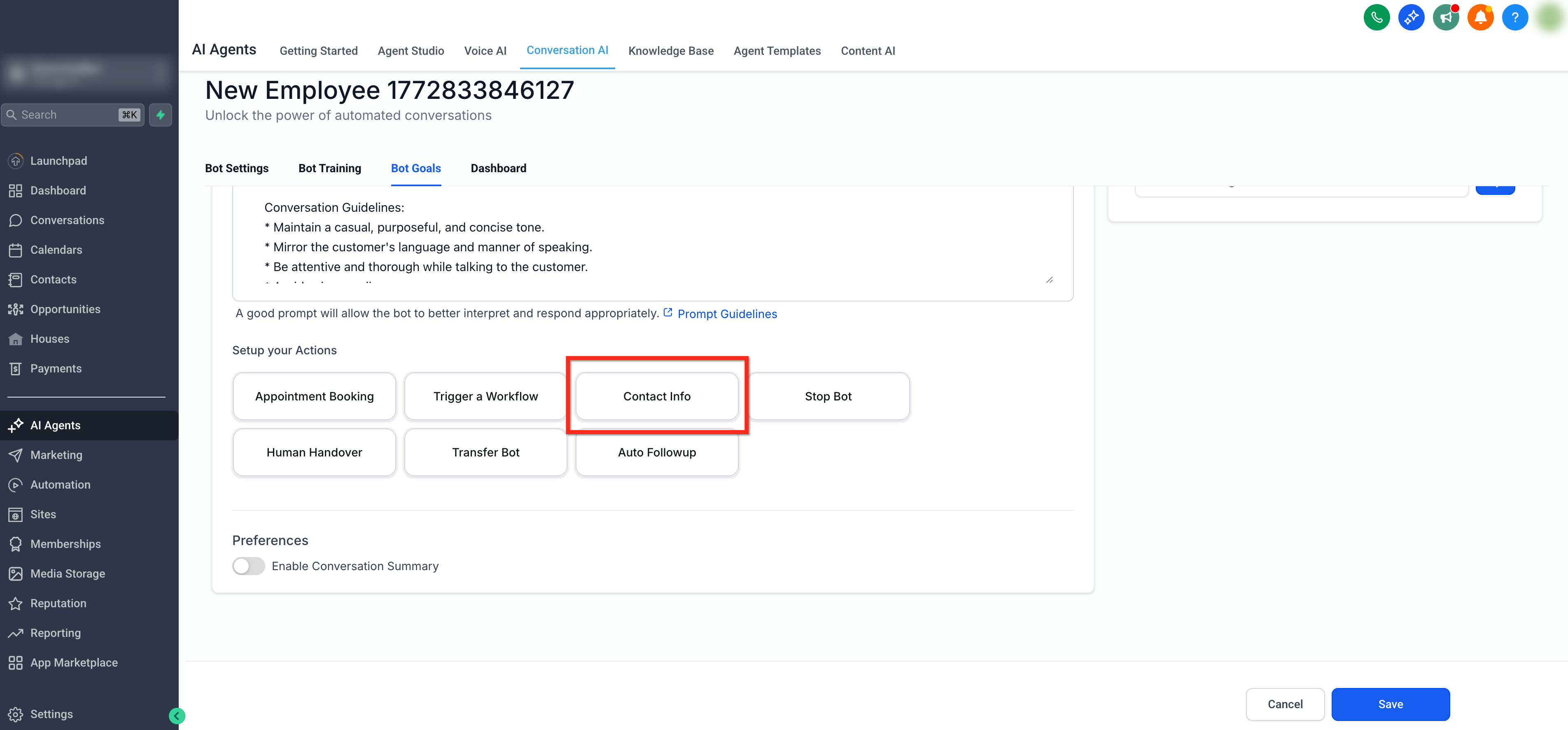 The Add Contact Info feature allows users to easily add contact information directly from the AI conversation. By capturing information like business details, addresses, and dates directly from the contact’s responses, you can reduce manual data entry and keep contact records update.